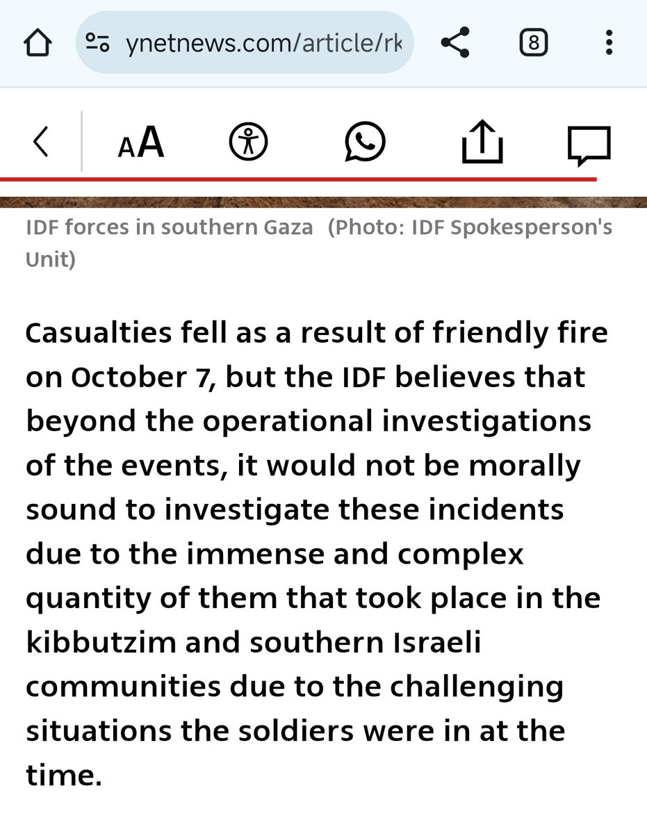This feels so wrong. Israeli newspaper Yedioth Ahronot quotes the IDF admitting "casualties fell as a result of friendly fire on October 7" but refusing to investigate because "it would not be morally sound [...] due to the immense and complex quantity of them that took place in the kibbutzim and southern Israeli communities" Src: https://www.ynetnews.com/article/rkjqoobip