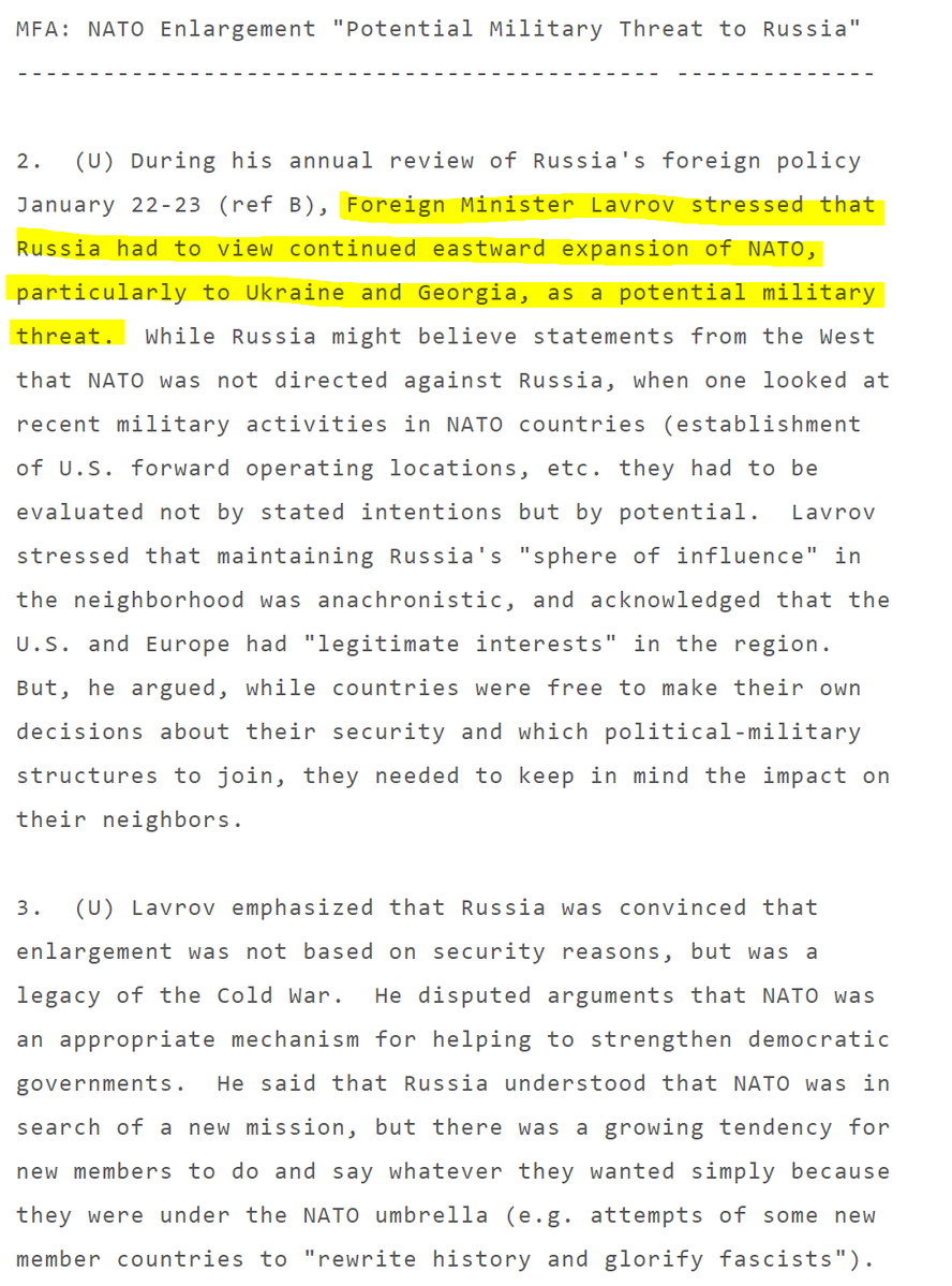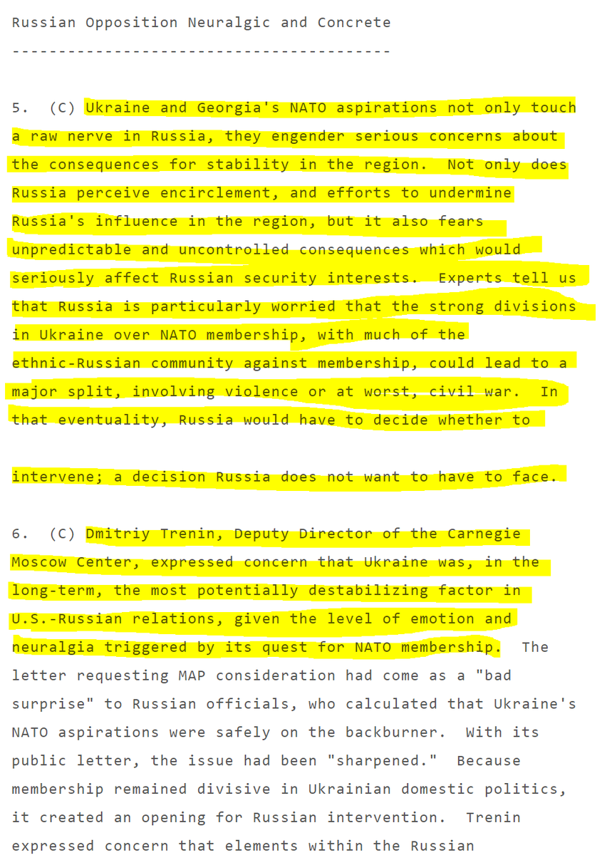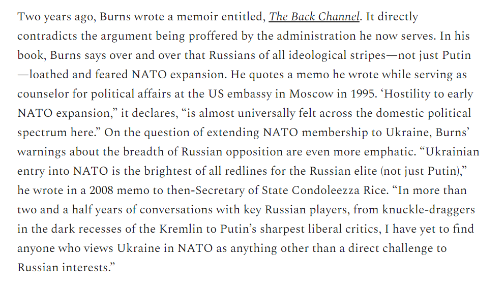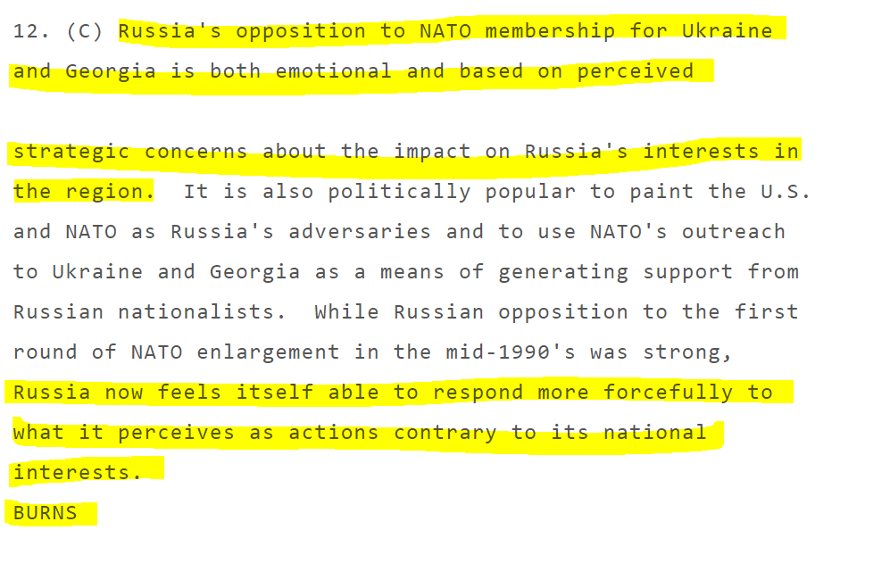 This is CIA director Bill Burns in 2008: "Ukrainian entry into NATO is the brightest of all redlines for [Russia]" and "I have yet to find anyone who views Ukraine in NATO as anything other than a direct challenge to Russian interests"