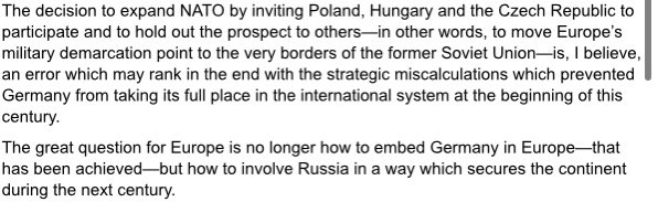 This is Jack F. Matlock Jr., US Ambassador to the Soviet Union from 1987-1991, warning in 1997 that NATO expansion was "the most profound strategic blunder, [encouraging] a chain of events that could produce the most serious security threat [...] since the Soviet Union collapsed"