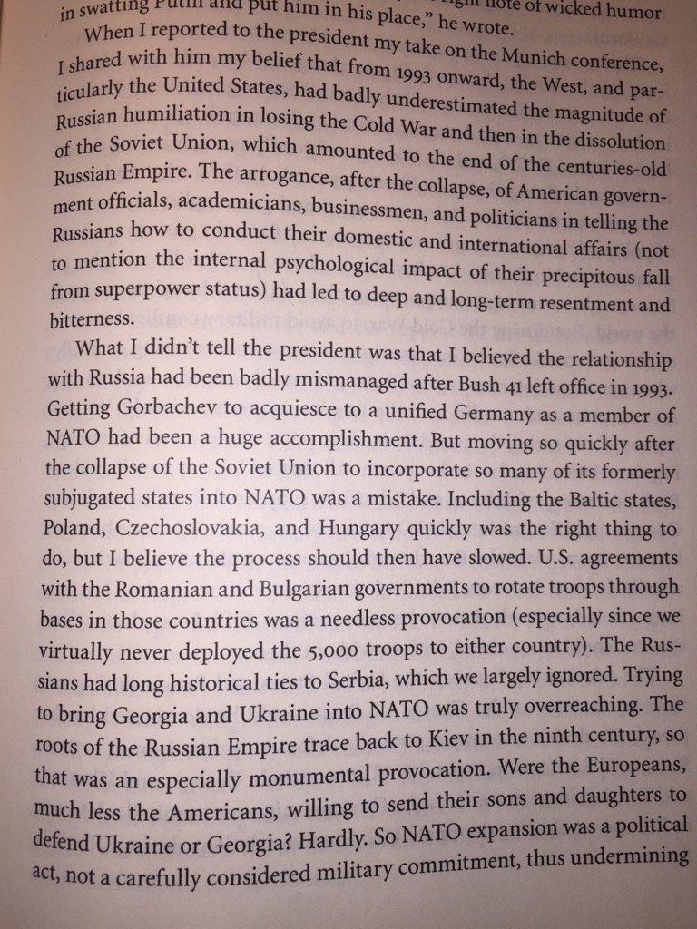 This is former US defense secretary Bob Gates in his 2015 memoirs: "Moving so quickly [to expand NATO] was a mistake. [...] Trying to bring Georgia and Ukraine into NATO was truly overreaching [and] an especially monumental provocation"