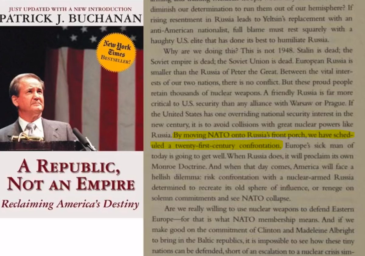 This is Pat Buchanan - assistant and special consultant to U.S. presidents Nixon, Ford, and Reagan - writing in his 1999 book A Republic, Not an Empire: "By moving NATO onto Russia's front porch, we have scheduled a twenty-first-century confrontation."