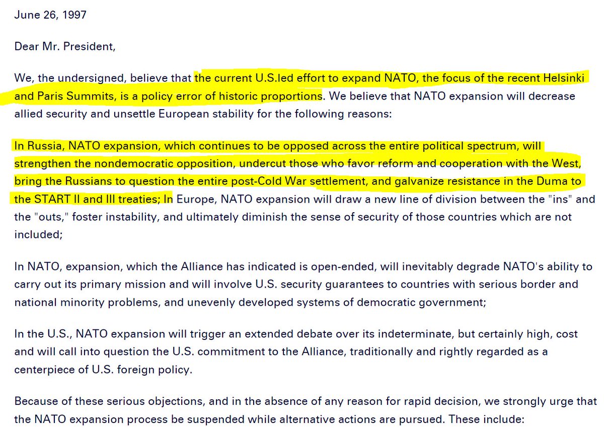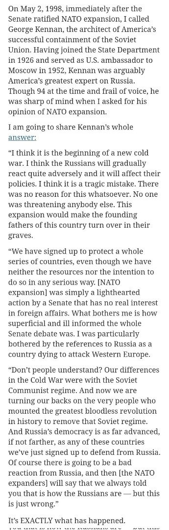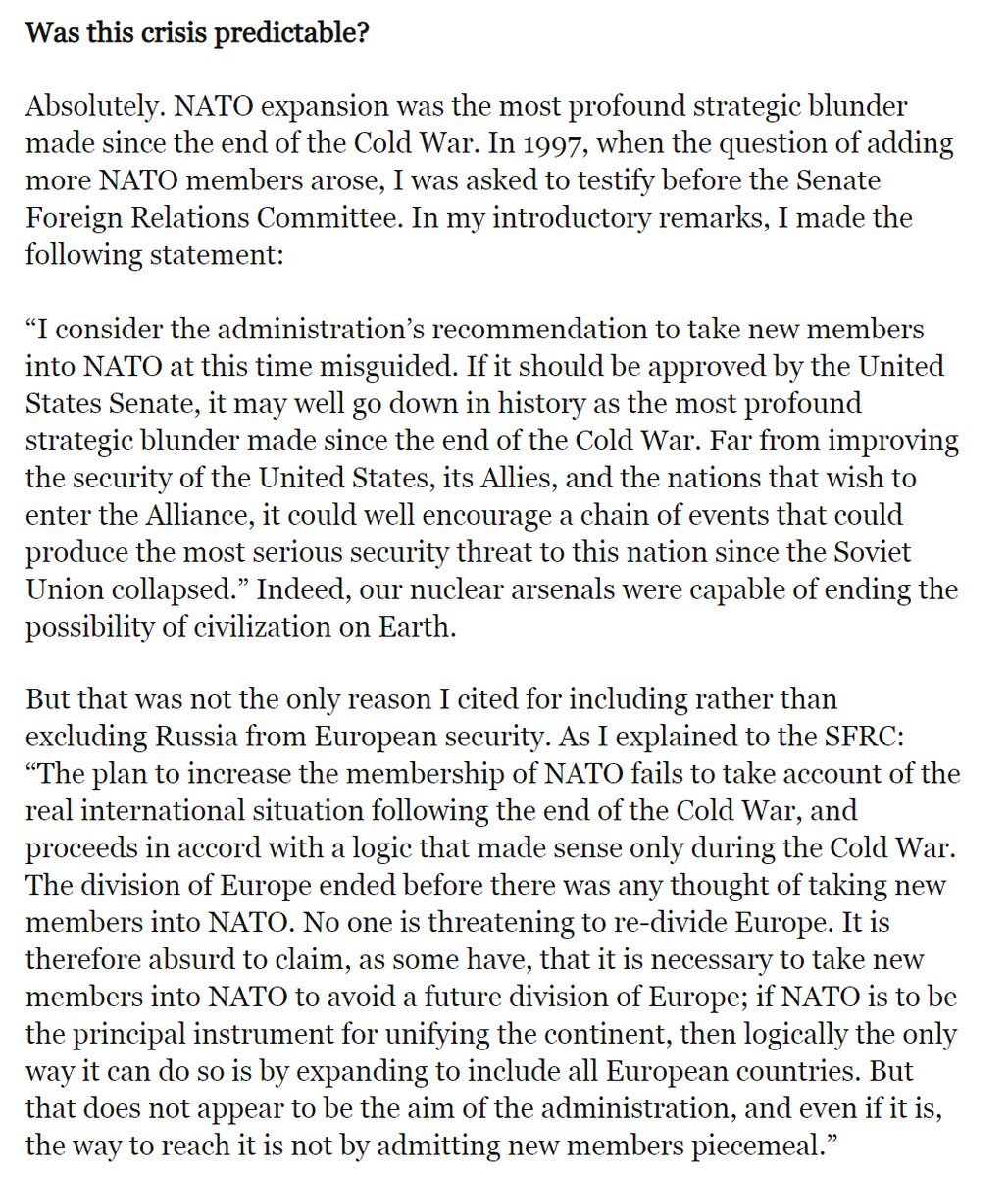 I get asked this all the time, so I am reposting my famous thread of all the top strategic thinkers - from Kissinger to Chomsky - who warned for years that war was coming if we pursued NATO expansion, yet had their advice ignored (which begs the question: why?).