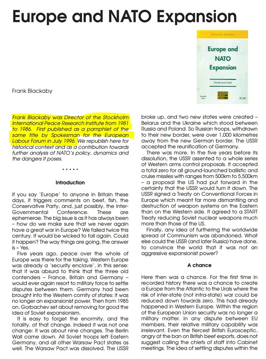 This is Frank Blackaby, former director of SIPRI, writing in 1996 that "any Russian Government will react, militarily as well as politically to [NATO’s expansion]" and that it makes "Europe drift [...] towards Cold War II".