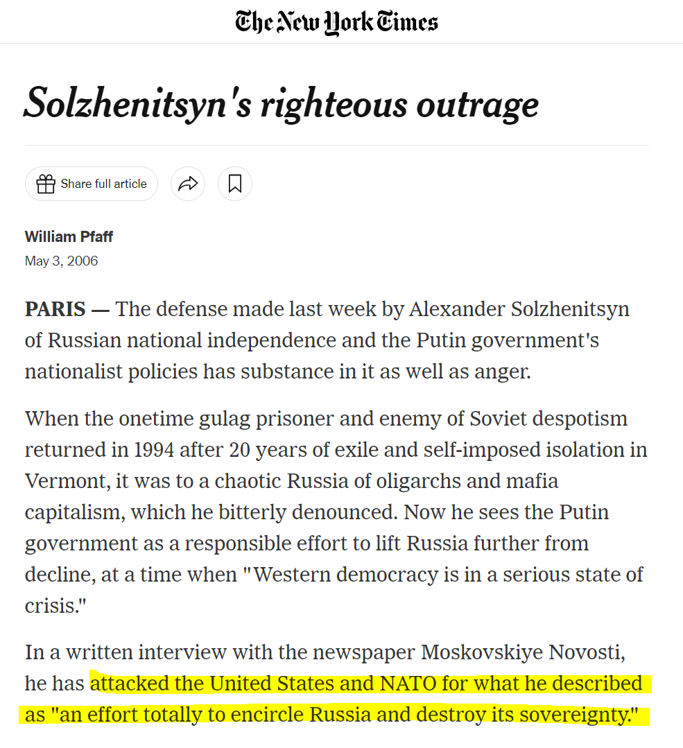Even legendary Soviet dissident Solzhenitsyn saw NATO expansion as "an effort to encircle Russia and destroy its sovereignty". He said Russia should "in no way dare betray the multi-million Russian population in Ukraine".(https://www.nytimes.com/2006/05/03/news/03iht-edpfaff.html and noblit.ru/node/1041 )
