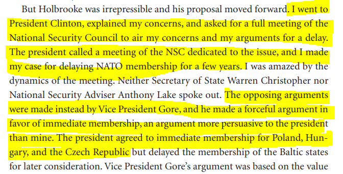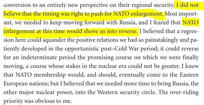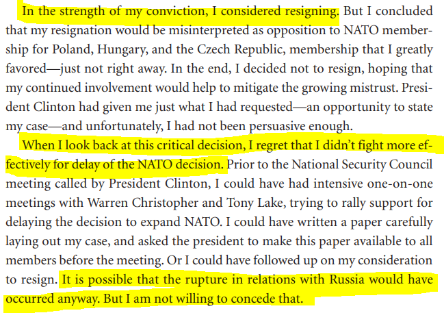 This is Clinton's defense secretary William Perry explaining in his memoir that to him NATO enlargement is the cause of "the rupture in relations with Russia" and that in 1996 he was so opposed to it that "in the strength of my conviction, I considered resigning".