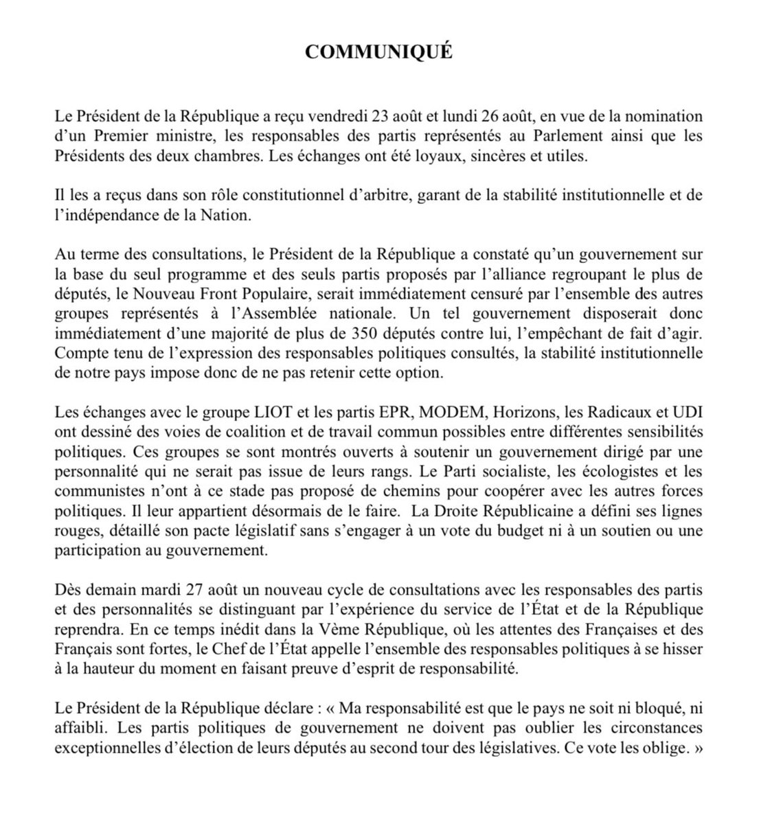 Update: it's now official, in a just-released communiqué Macron has rejected a government led by the New Popular Front (NPF). It's an unprecedented situation in the history of the 5th French Republic: the loser in the election effectively rejects yielding power to the winner. He explains it by the fact that his "responsibility is to ensure that the country be neither blocked nor weakened", arguing that were he to nominate a NPF government they'd soon be censored by parliament and destituded. That may be the case but still this awfully inconvenient fact remains: Macron's party got way less votes and MPs than the NPF, yet it is Macron's party that's still running the French government, and it is Macron himself making choices on who can or cannot assume power based on what he thinks would "weaken France" or not. It's insane when you think about it.