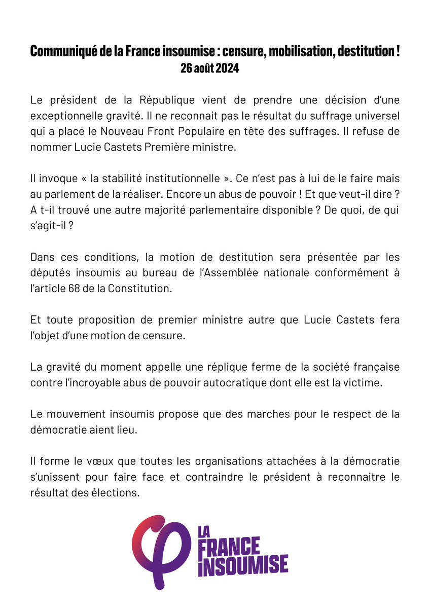 And now a communiqué by La France Insoumise ("France's unbowed"), the main political force in the New Popular Front coalition, in reply to Macron's decision. They announce they're moving ahead with an impeachment procedure against Macron. https://t.co/8Yv7GcU7g2