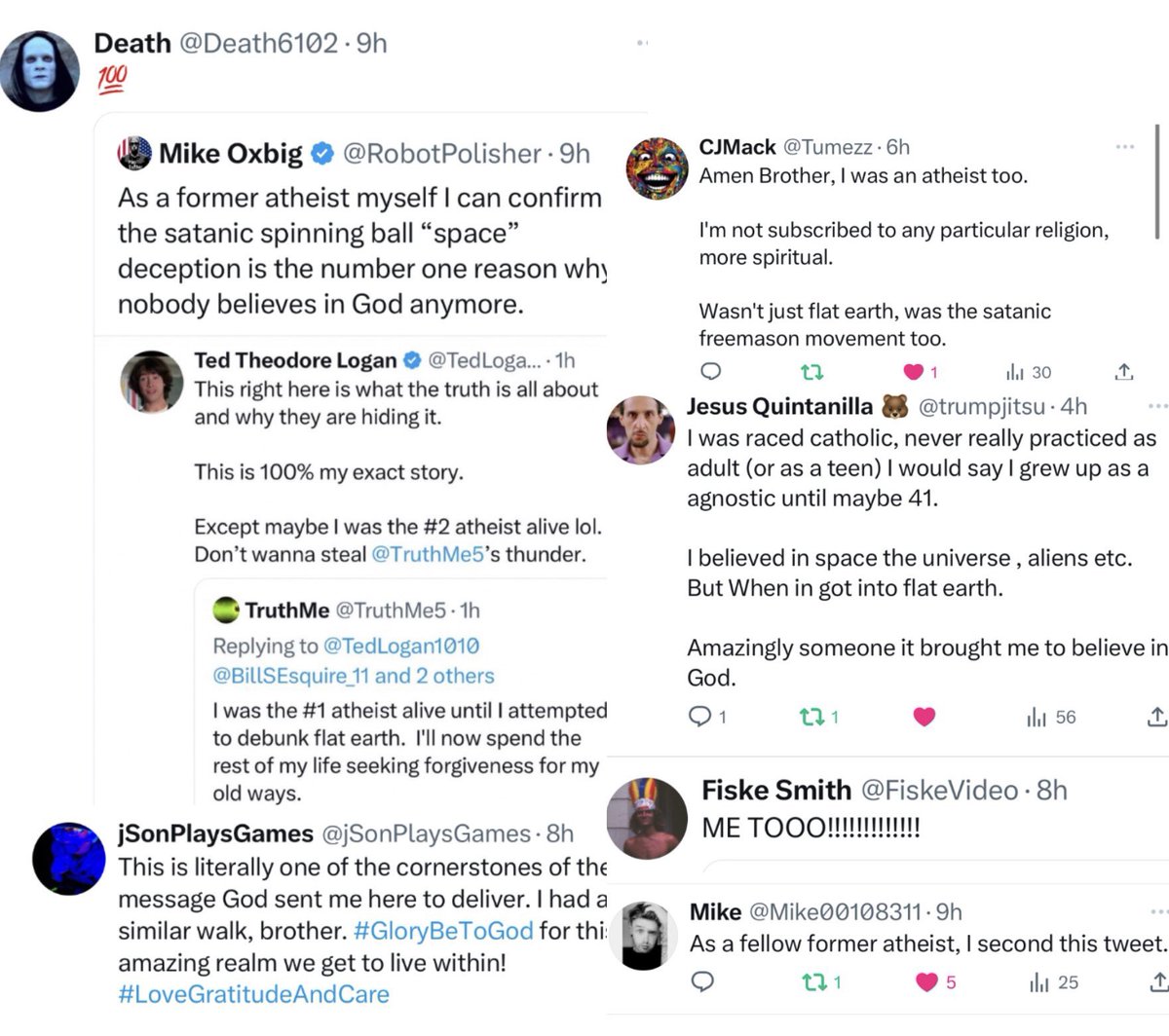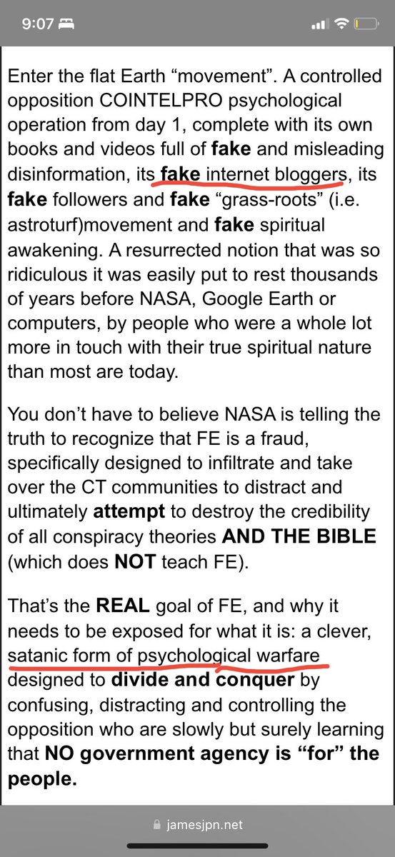 Flat earth is a nefarious “psyop” that tricks people into believing something that every single civilization throughout time had unanimously agreed on before a few hundred years ago. The ones who fall for it all become unvaccinated pro-life believers in God! None of them even believe in a “climate emergency”, overpopulation, or support war in Ukraine! You definitely won’t find a single group of people on this spinning ball we’re on more united against the new world order than flat earthers. What a brilliant “psyop” 🫡
