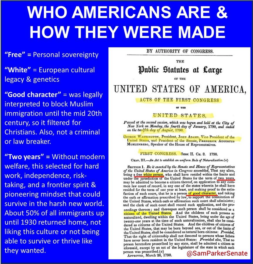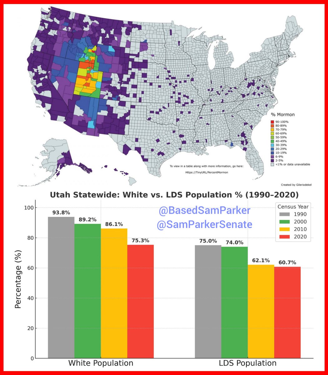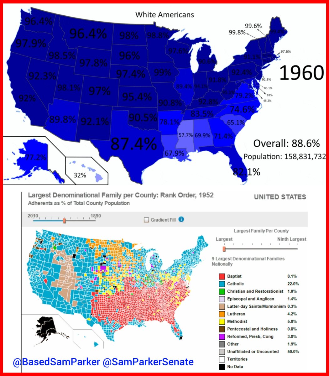 1/ Can Utah still be "Utah" if it ceases to be White & Mormon? Can America still be "America" if it ceases to be White & Christian? Utah: Founded, colonized & built by White Mormons (The Church of Jesus Christ of Latter-day Saints, LDS). In the 1990s, after a 49-year colonization period followed by 100 years of statehood, Utah was still 90% White & 75% LDS. Note that LDS membership hasn't ever been required to hold office or establish residency in Utah, nor has the LDS church ever been enshrined as the official state church in any founding document. Even so, anyone who's spent any time in Utah would easily observe Utah's distinctly peculiar White Mormon culture permeating everywhere, impacting nearly everything. Even the grid-layout road system is Mormon! Regardless of someone's personal feelings toward the LDS faith, any intellectually honest soul would acknowledge that Utah would cease to be uniquely "Utah" if it ever ceased to be [White + Mormon]. Anyone alleging otherwise is simply too stupid or disingenuous to even waste breath on. America: Founded, colonized & overwhelmingly built by White Christians of various European ethnicities & Christian denominations. In 1965, after a 169-year colonization period followed by nearly 200 years of nation-building, America was still 89.5% White & 93% Christian. So, I ask again: Can America still be "America" if it ceases to be [White + Christian]? Can your answer really be any different than your answer for Utah? In this thread, we will review some of the White Christian origins, organizing principles & foundations of America. Please leave your comments and feedback.