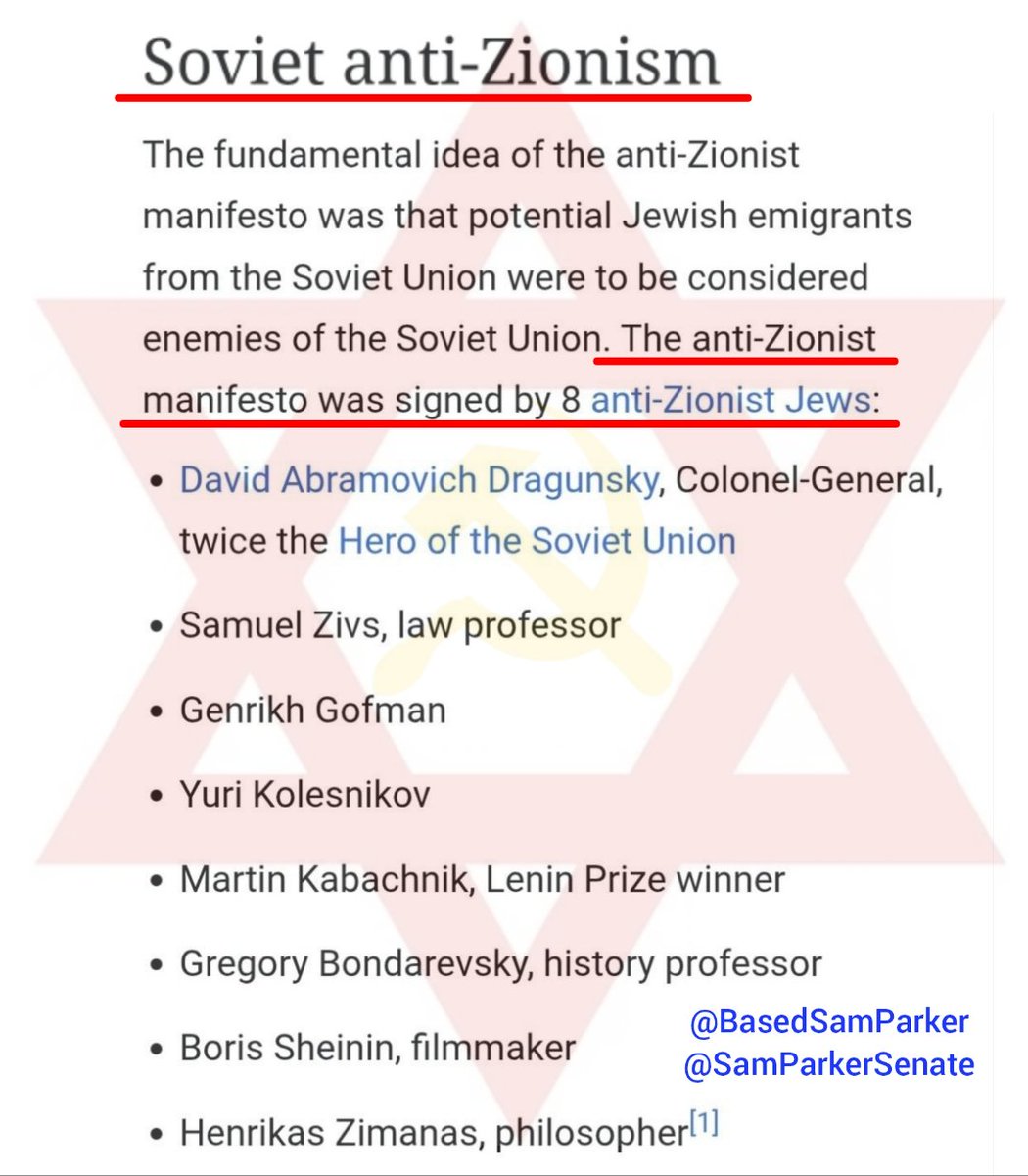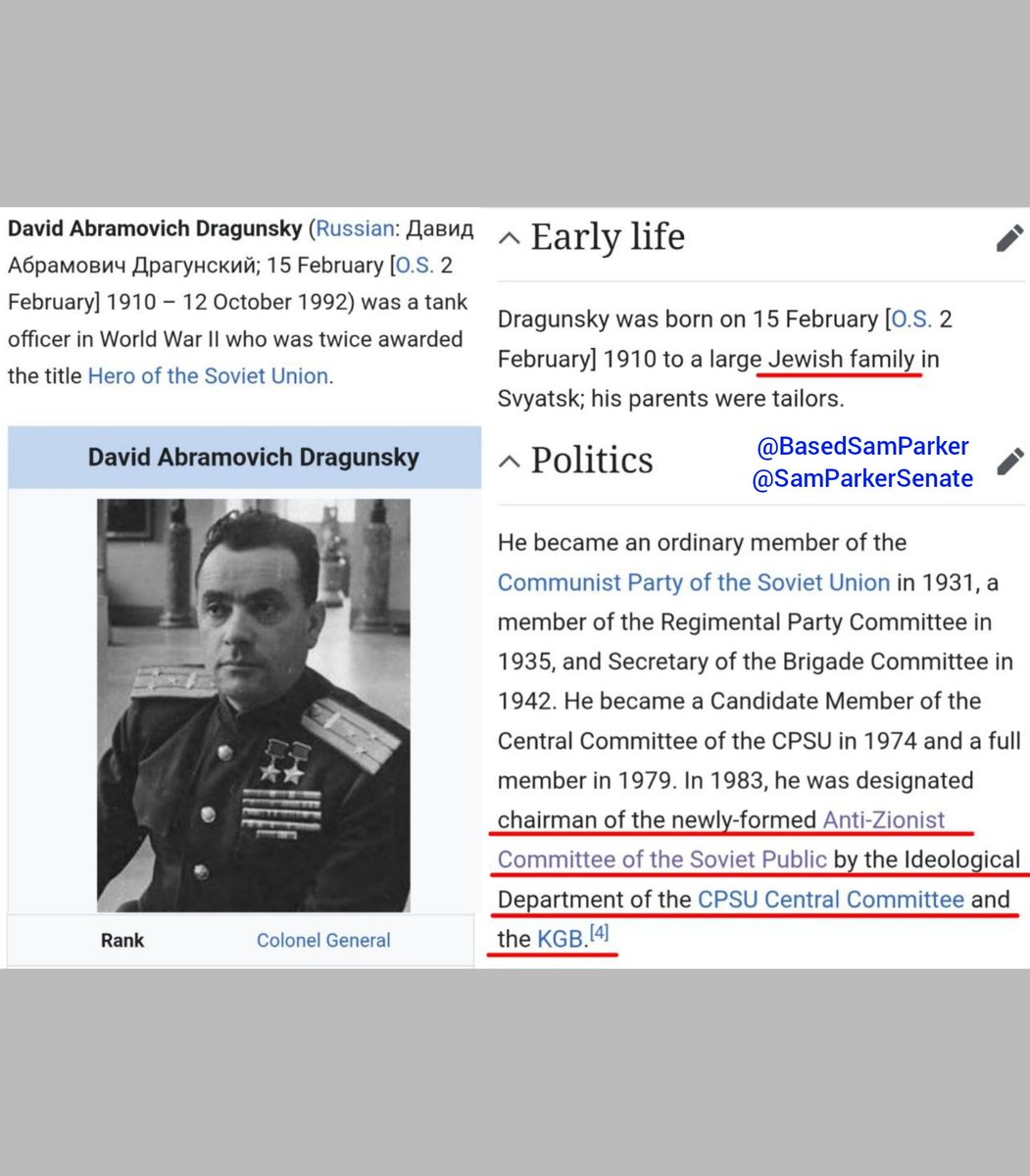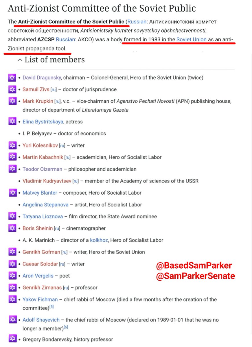 13/ jewish involvement in the anti-zionist project ran deep. The operation came to be led by the "Antizionist Committee Of The Soviet Public"—which was comprised of nearly all jews & even run by a jew—General David Dragunsky! That's right, jews ran the anti-zionist operation. Lol https://t.co/gqHhw7McGL
