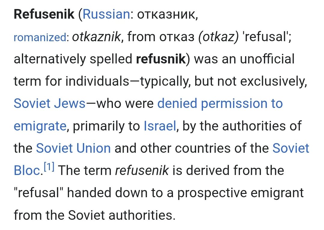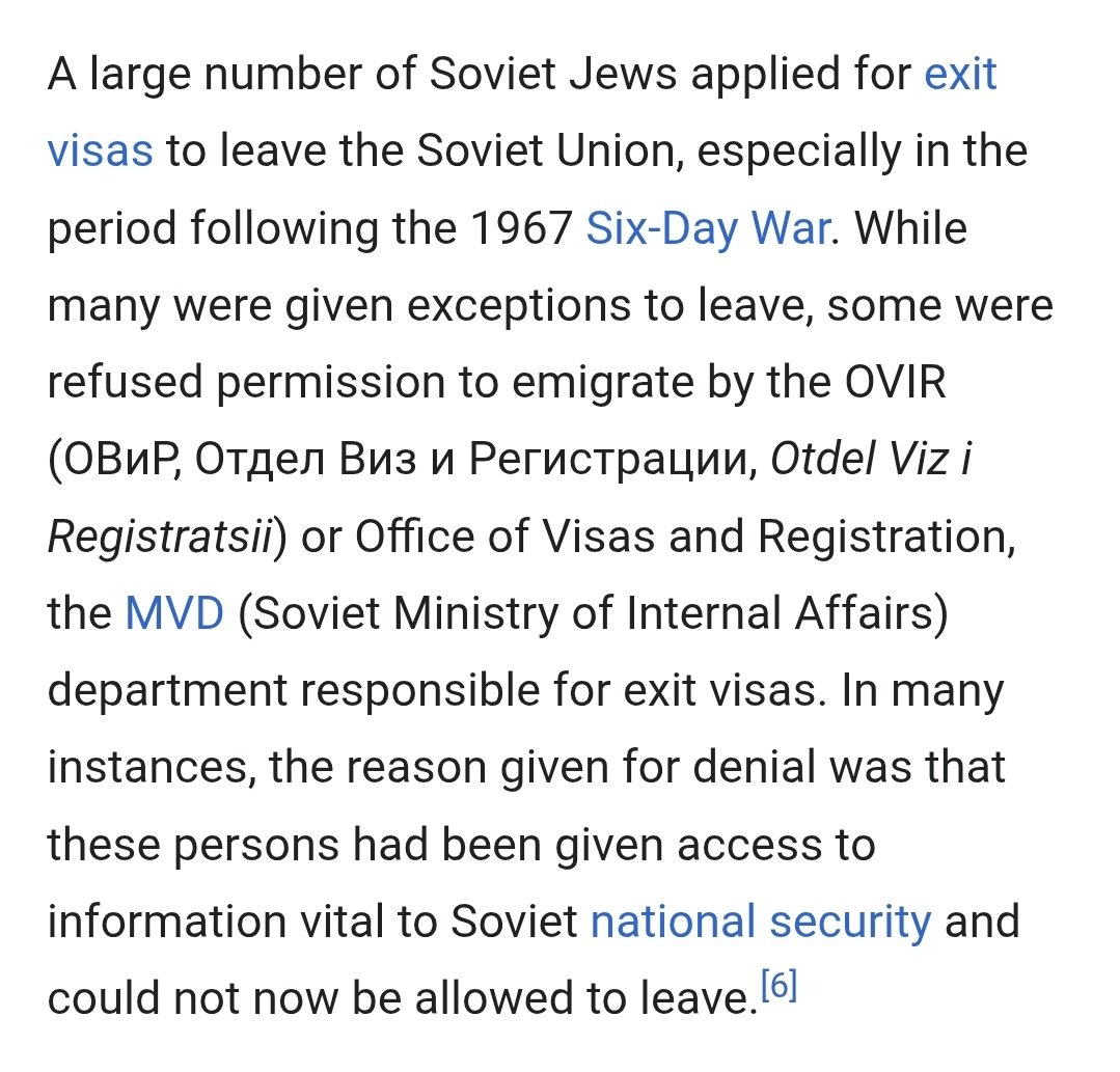 8/ They also wanted to dissuade jews from immigrating to israel. Jewish desires to leave the USSR greatly increased after israel's victory in the 6-Day War (1967). Many were seen as a security risk, though. Soviet jews who were denied emigration were called "Refuseniks." https://t.co/Aw8aNBeFFd