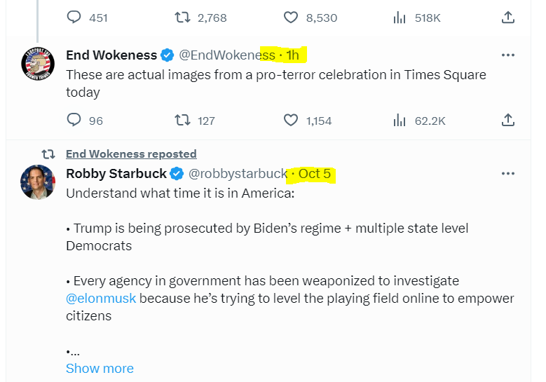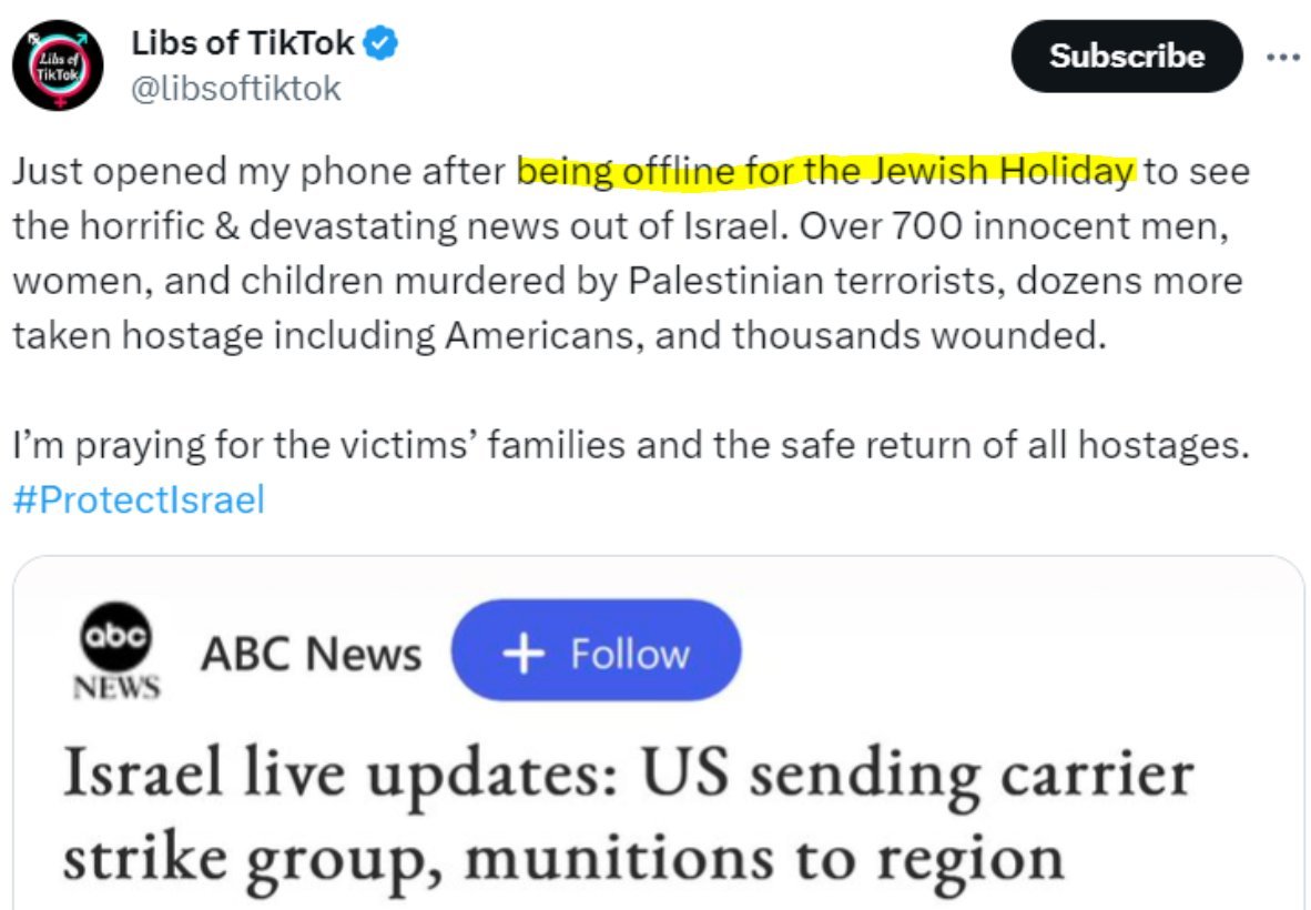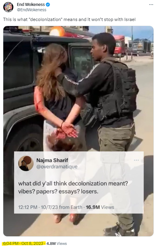 🚨🇮🇱 EVIDENCE "@ENDWOKENESS" IS JEWISH: 🔹After you retweeted Robby Starbuck on Thursday, October 5th, you didn't tweet again until Sunday, 5:05 PM (Pacific). Even though the biggest event of the year popped off on Saturday, October 7th, you were nowhere to be found. Why? 🔹Libs of TikTok, who is known to be jewish, also was offline during that same time frame--and returned to Twitter at about the same time as you on Sunday. Why was she gone? As she said, "the jewish holiday." 🔹Within an hour of being back on Twitter, you were promoting the "decolonization" messaging--a talking point known to be popular amongst, and promoted by, other prominent jewish/zionist accounts. Question: Are you indeed jewish?