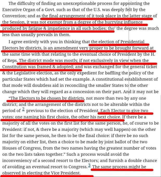 2. The beginning of the Electoral College requires us to only go to 1823, though--not 1787. That's when James Madison explained in a letter to George Hay the original thinking behind the EC. Here are 4 different formats of the letter: 3 pics & a link. https://founders.archives.gov/documents/Madison/04-03-02-0109