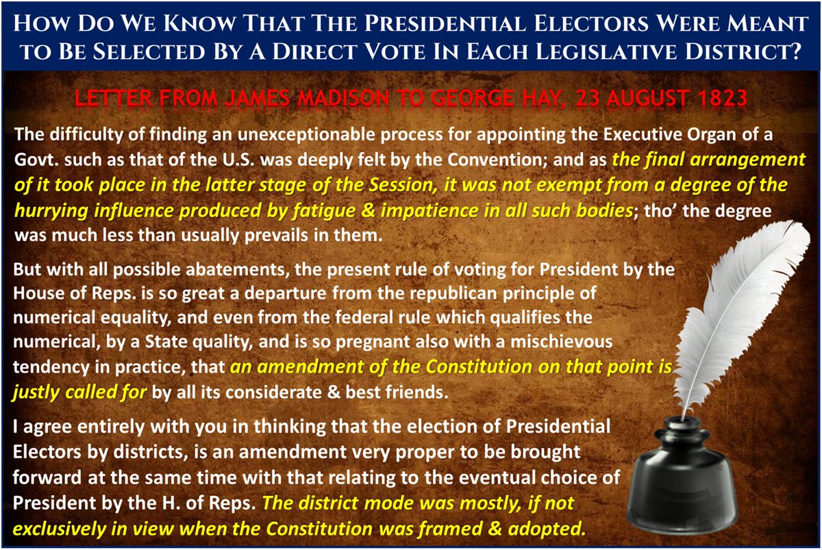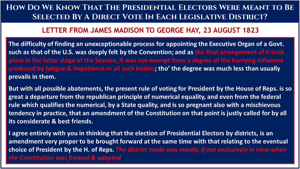 5. James Madison's letter to Hay was an endorsement of enshrining the "National Caucus" Electoral College into the Constitution by amendment (as originally intended), b/c several states had already started awarding their electoral votes by direct vote for president as we do now.