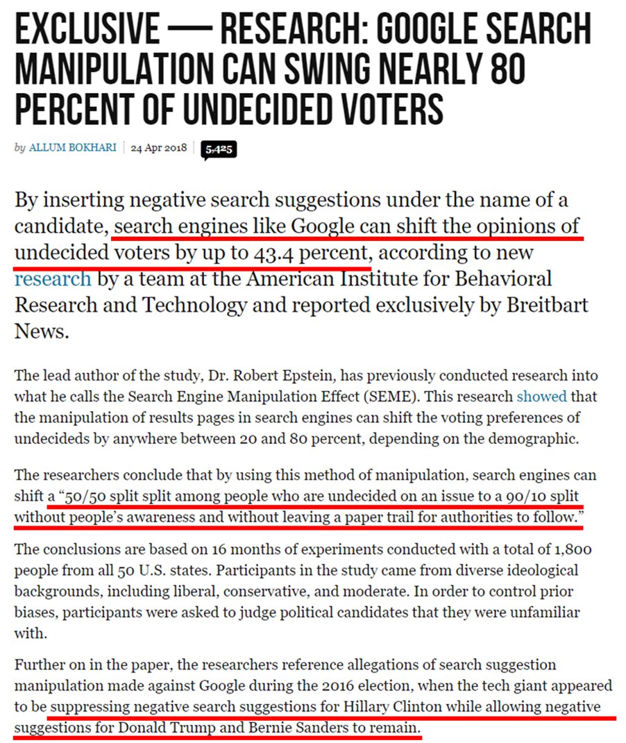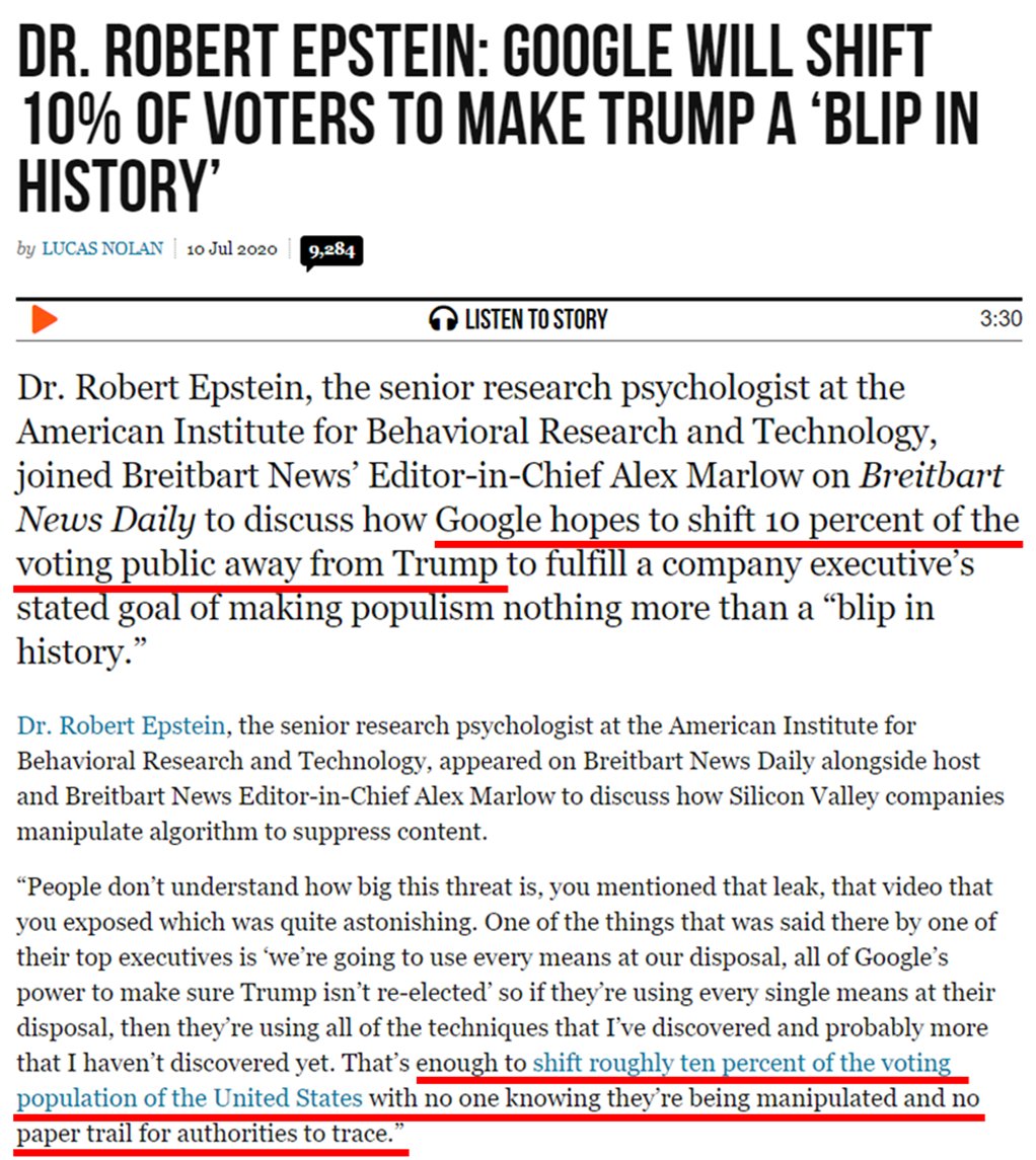 23. Dr. Robert Epstein has studied, published & testified before congress on the power Google has to sway votes & elections through various methods of manipulation--unbeknownst & non-transparently to voters. Google is on record as trying to do anything it can to stop Trump.