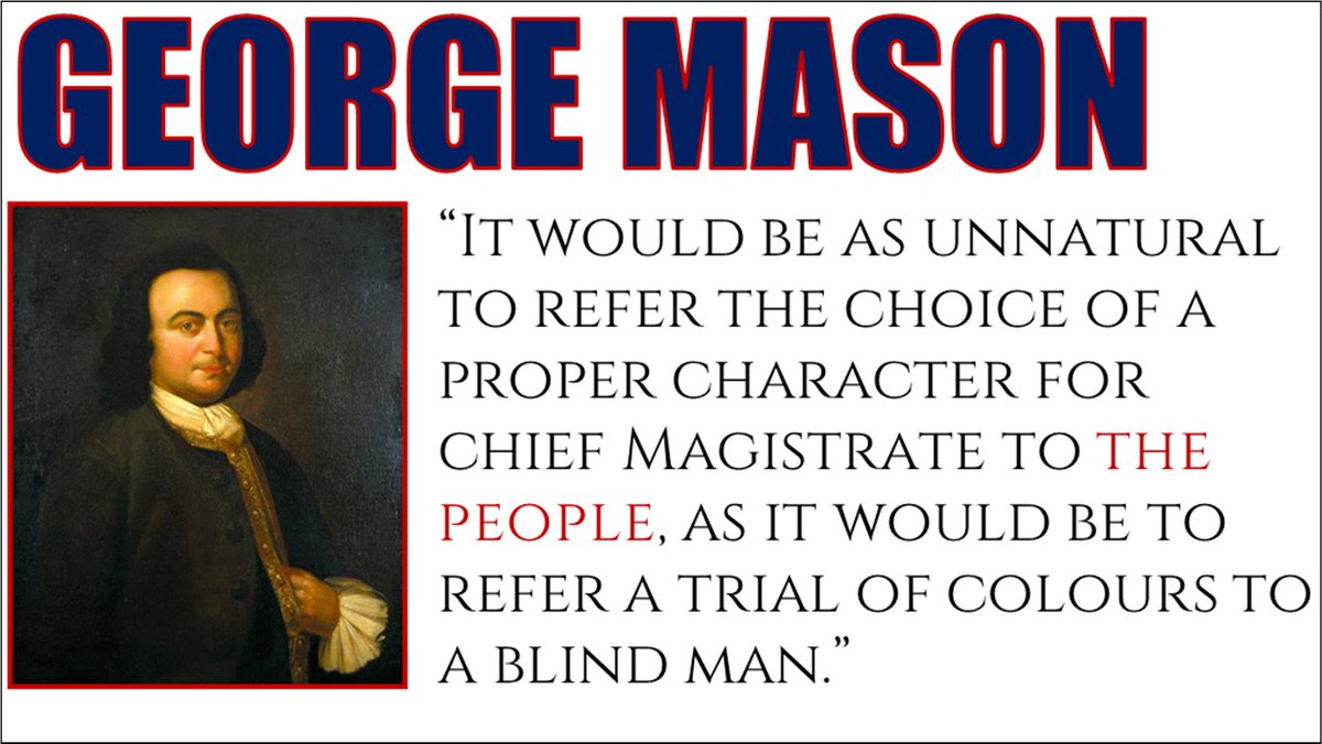 8. George Mason: "It would be as unnatural to refer the choice of a proper character for chief Magistrate to the people, as it would be to refer a trial of colours to a blind man." Mason understood direct democracy. He knew something so important shouldn't be left to mob rule.