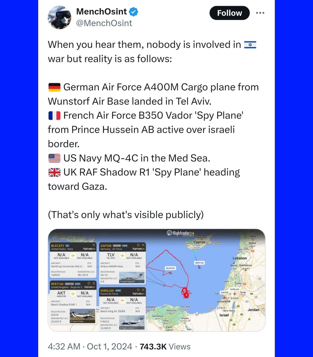 @KimDotcom 🧵5/ These are all terrible signs that a major strike on Iran is on the way. On October 1st, when Iran struck israel, assets from various NATO countries were involved. @MenchOsint So this probably isn't just the US involved, it's also "NATO." https://t.co/zqt2XizI6M