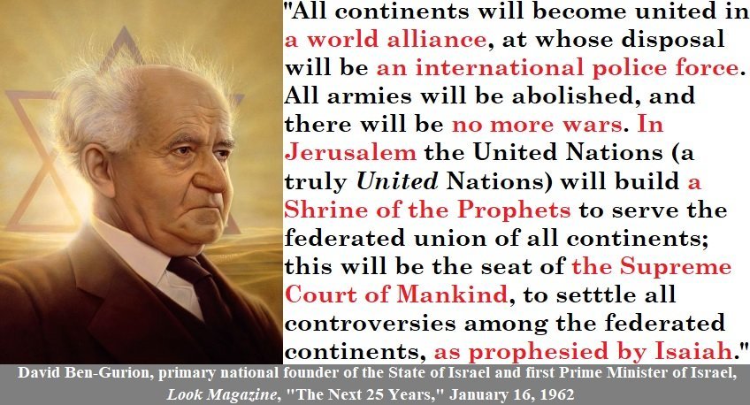 🧵6/ David Ben Gurion, First Prime Minister of Israel (who was instrumental in securing nuclear weapons for israel & removing JFK as the main obstacle): "AII continents will become united in a world alliance, at whose disposal will be an international police force. All armies will be abolished, and there will be no more wars. In Jerusalem the United Nations (a truly United Nations) will build a Shrine of the Prophets to serve the federated union of all continents; this will be the seat of the Supreme Court of Mankind, to settle all controversies among the federated continents, as prophesied by Isaiah."