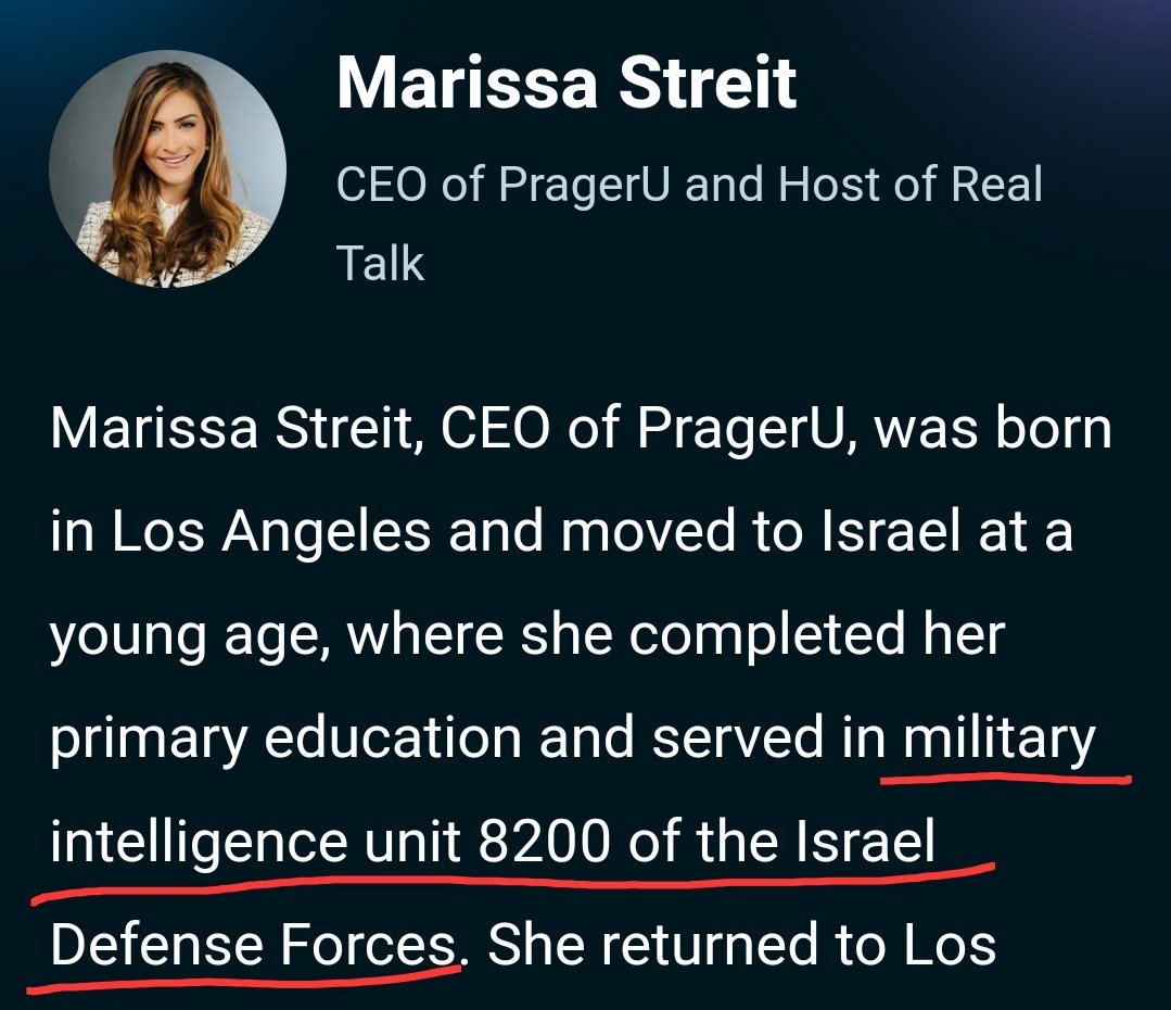 🧵5/ But perhaps you weren't aware that the CEO of his "Prager University," Marissa Streit, is spy who's sworn loyalty to israel? https://t.co/l5QkVdL87A