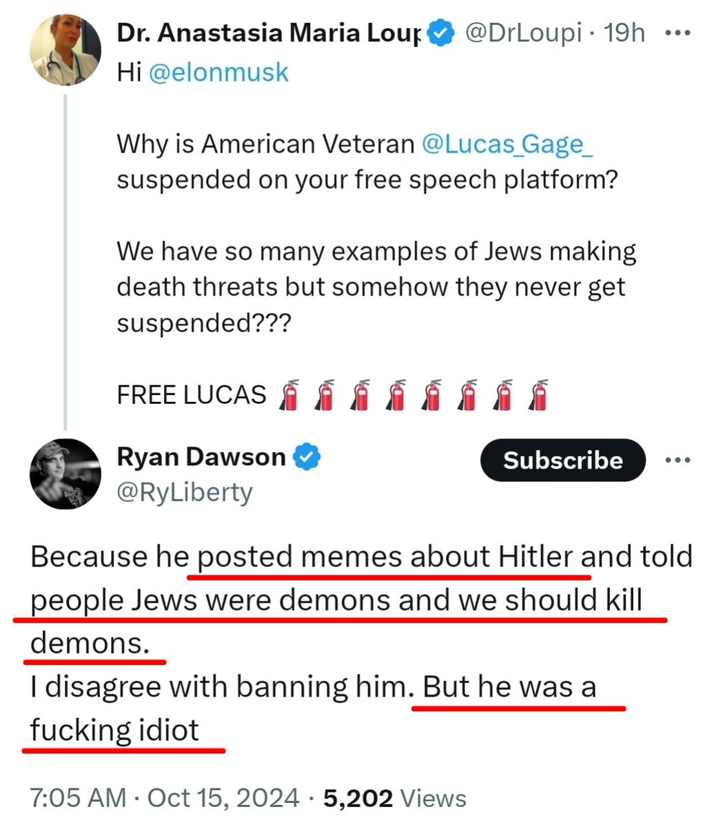 🧵 Ryan Dawson is perpetuating a lie here in his backhanded "defense" of Lucas Gage. Lucas was not suspended for "posting memes about Hitler," nor did he say "we should kill demons" (or jews). I'm not sure how Ryan thought smearing Lucas was helpful on a tweet appealing Lucas's suspension to Elon Musk. Receipts included in the thread below, and Lucas will address this in his livestream today on his Rumble.