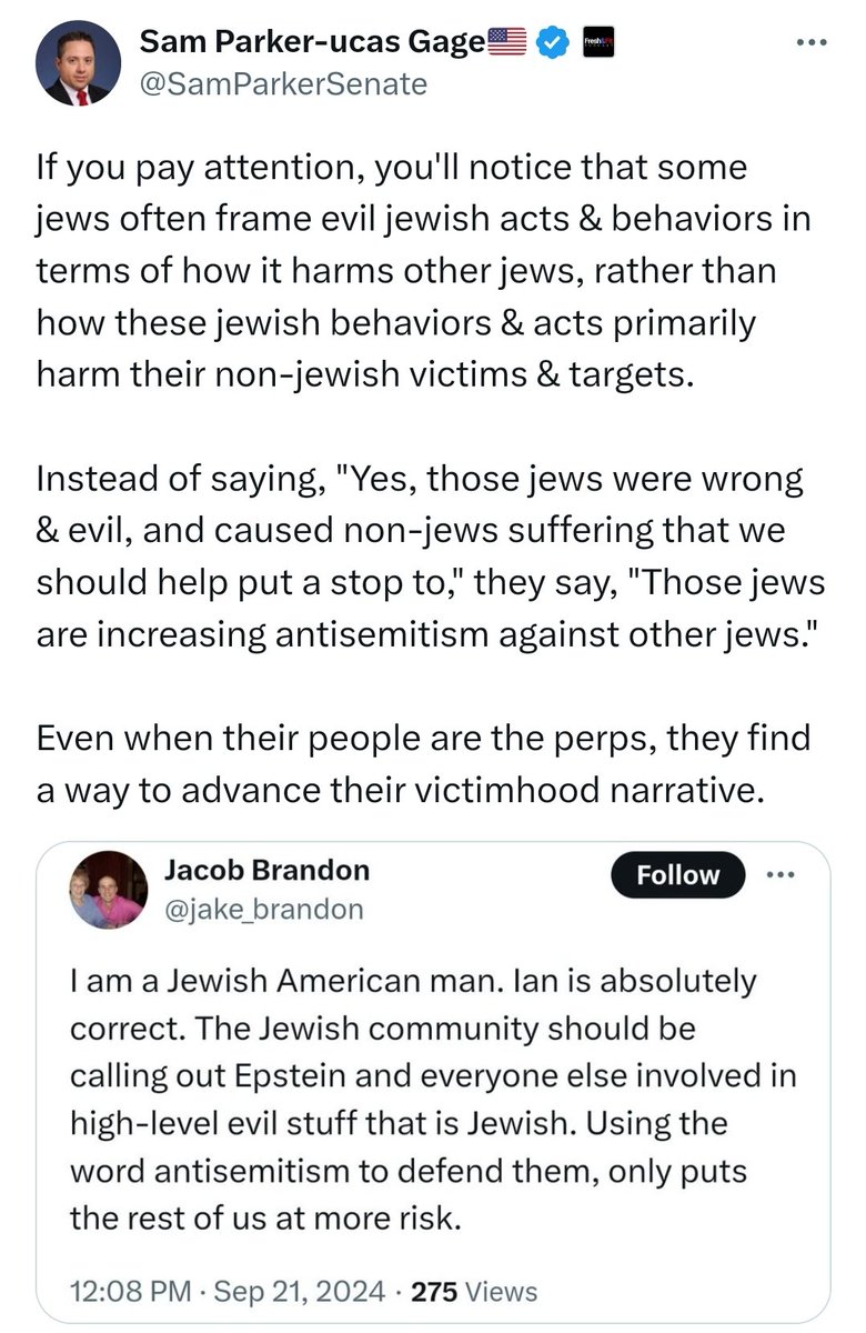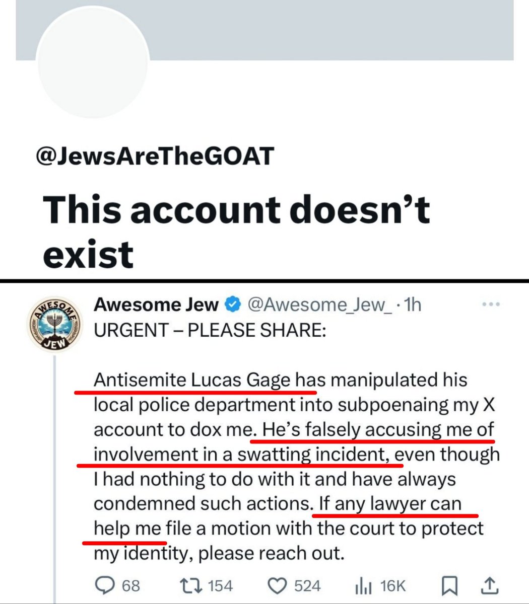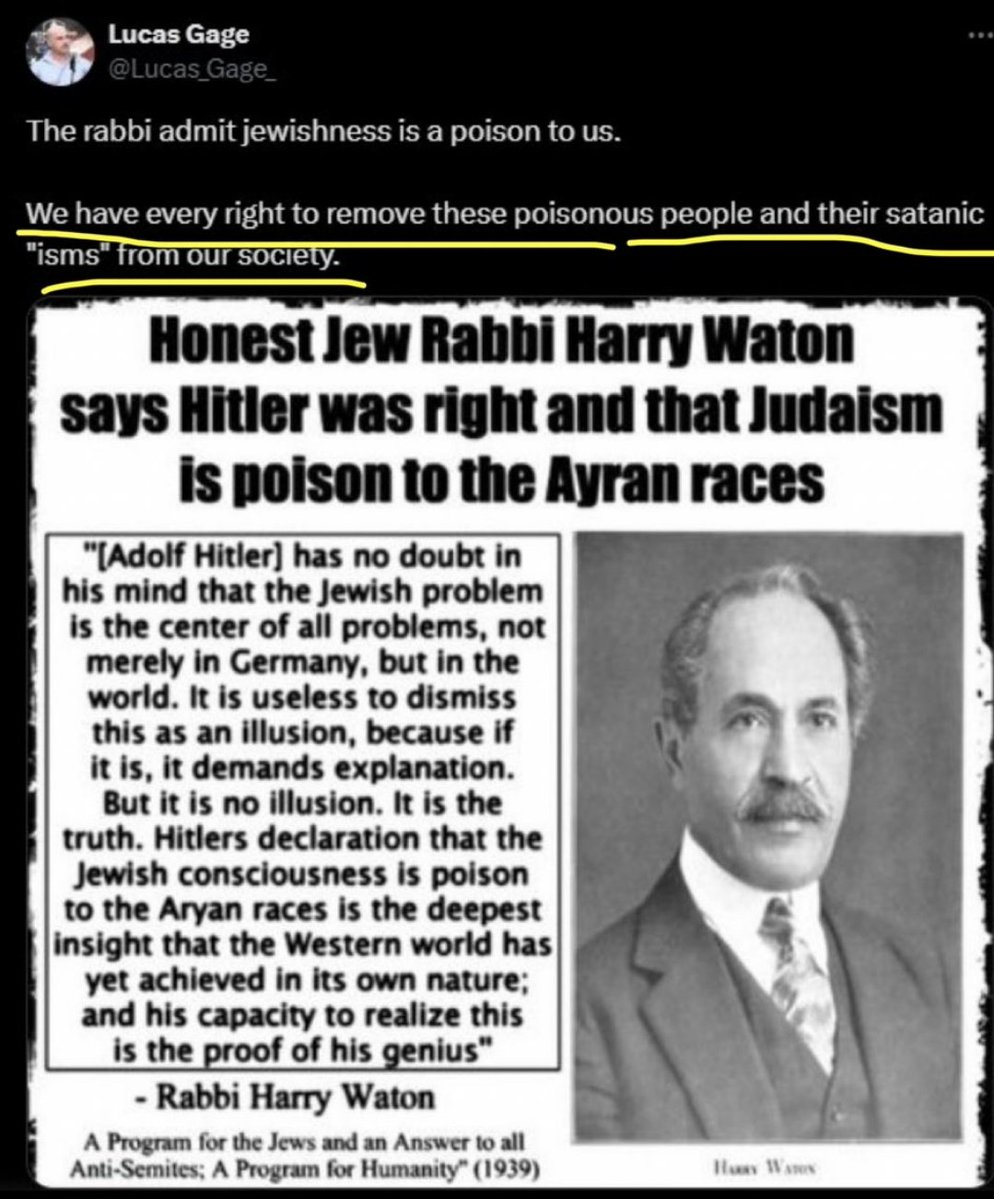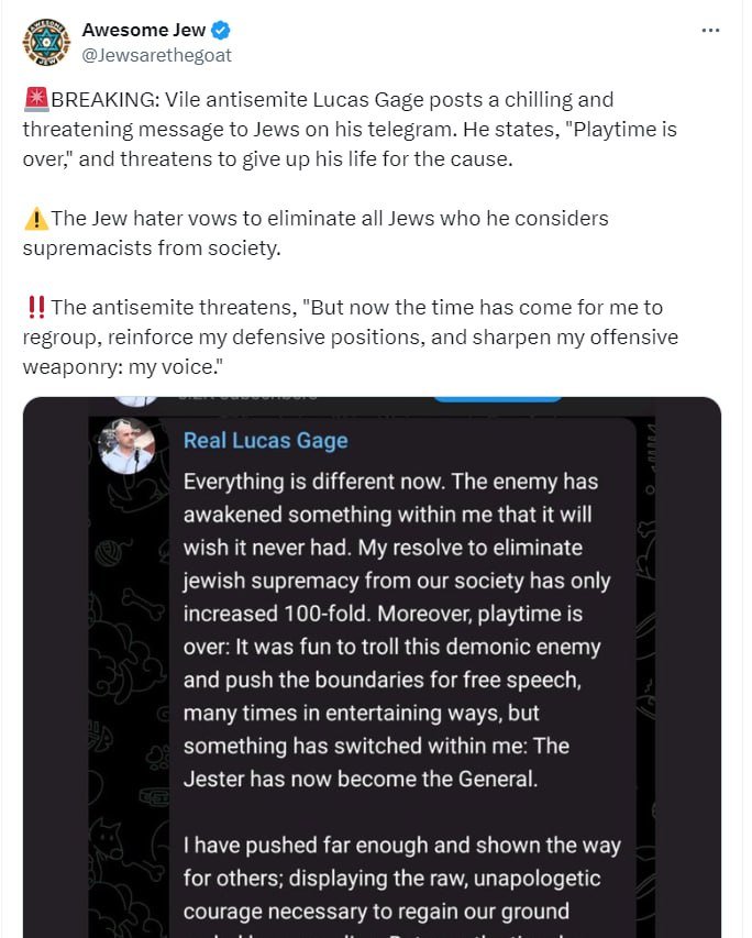 🚨 BREAKING: A jew just threatened to open fire on Lucas Gage's house. Dear @ElonMusk & @LindayaX, Gage has had to evacuate his wife & children. This follows weeks of several jews inciting violence toward him, and lying to law enforcement to get him 'SWATted.' How would you feel if this were happening to your family? Please feel some empathy for Lucas. Thousands of jews submitted fake reports to @X to get his account suspended so that he can't let his followers know what's happening. The jews behind this now pose a clear and present danger and are using X to, in part, coordinate their actions. Please make this right and reverse the suspension.