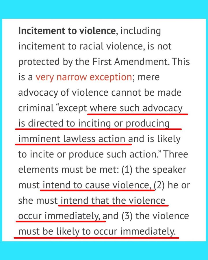 🧵3/ As for "posting Hitler memes" 1. Many people post Hitler memes, so that's just reductive nonsense. 2. It was a single meme, not "memes" and it was actually a quote from a jewish rabbi referencing Hitler. We could just as easily call this a "rabbi meme." 3. Elon Musk said this tweet was a "clear incitement to violence." This was his stated reason for suspending Lucas for 6 months until January 6, 2025. Let's debunk Elon, shall we? First, Lucas made an observation, not a call to action: "we have every right" is a statement of opinion about an action. There's not actually any incitement here. But even if you still think he's calling for an action, it's not a *clear* incitement to violence. Lucas could easily be referring to any number of peaceful & legal remedies. Many people & groups considered "poisonous" are removed in peaceful/legal ways: illegals are deported; criminals are given due process and prosecuted legally; pariahs are ostracized; tyrants are removed from power through elections or impeachment; religious congregations expel or excommunicate congregants, and still other populations are simply ignored or marginalized through voting or other non-violent means, etc. The imputing of violence to this tweet is extremely superficial, shallow, unsophisticated and not well thought out. In short, it's imposing the sensibilities of the accuser onto the text. Furthermore, the American justice system has established a thorough set of criteria as to what constitutes "incitement to violence" and his tweet doesn't fulfill a single one of them. If it had actually been incitement to violence, Lucas should have been arrested, but he wasn't--and the reality is law enforcement is still investigating the people who got Lucas swatted. IOW, law enforcement sees Lucas as a victim, not the perp Elon Musk painted him as. 👈 Lucas's Tweet Legal threshold for "incitement" 👉