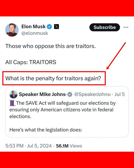 🧵4/ Let's compare what Lucas tweeted to what @ElonMusk himself tweeted *after* suspending Lucas. Elon: "What is the penalty for traitors again?" Sounds like Elon wants to "remove poisonous people from our society," right? Lucas Gage said we have the right to remove "poisonous people from our society," but Elon said that was "incitement to violence" & banned him for 6 months. Surely, it can be seen that Lucas didn't intend any violence or incitement to violence--just as Elon didn't here. I think in light of this, Elon should re-instate Lucas.