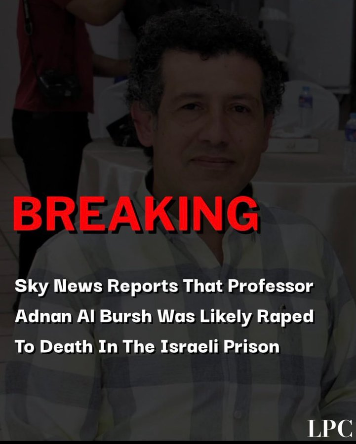 🚨🧵1/ KIDNAPPED, IMPRISONED, TORTURED, RAPED & MURDERED: The Story of Renowned Palestinian Orthopaedic Surgeon, Dr. Adnan Al-Bursh SUMMARY: Dr. Al-Bursh was trained at Kings College in Britain. He was extorted with the death of women & children at his hospital & kidnapped by the IDF last December. He was imprisoned & tortured for 5 months until he succumbed to his internal injuries. The Israeli Prison System (IPS) denies any of this happened. He leaves behind his wife & 6 kids, living in an abandoned school in Central Gaza. TESTIMONIALS: "[The director] told us that the [Israeli army] have full data of all males aged between 14 and 65 at Awda hospital," Dr Obeid* said, tearfully. "They told him (Dr. Al Bursh) that if all men do not come down… they will destroy the Awda Hospital with all the women and children in it." "In mid-April 2024, Dr Adnan Al-Bursh arrived at Section 23 in Ofer Prison. The prison guards brought Dr Adnan Al-Bursh into the section in a deplorable state. He had clearly been assaulted with injuries around his body. He was naked in the lower part of his body. "The prison guards threw him in the middle of the yard and left him there. Dr Adnan Al-Bursh was unable to stand up. One of the prisoners helped him and accompanied him to one of the rooms. A few minutes later, prisoners were heard screaming from the room they went into, declaring Dr Adnan Al-Bursh (was dead)." UPDATE: *Dr. Obeid, who was interviewed in this video report, has now also been kidnapped by the IDF and Doctors Without Borders are extremely worried. He's probably already been tortured & raped himself.