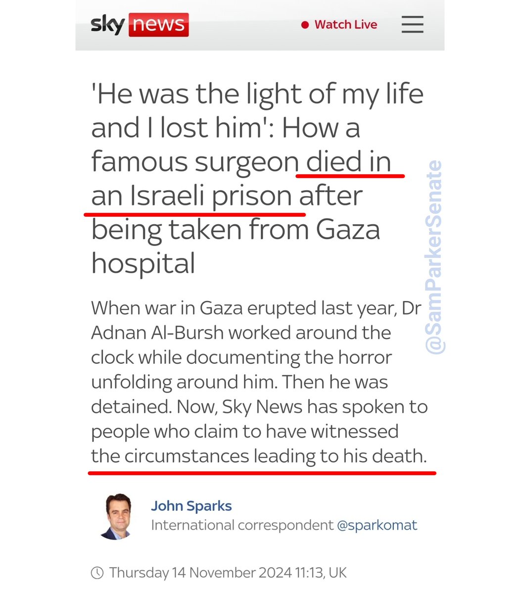 🧵2/ The video recounts a horrific story of Dr. Al-Bursh, but the headline of the article reads like the IDF itself wrote it. @sparkomat https://news.sky.com/story/he-was-the-light-of-my-life-and-i-lost-him-how-a-famous-surgeon-died-in-an-israeli-prison-after-being-taken-from-gaza-hospital-13253157