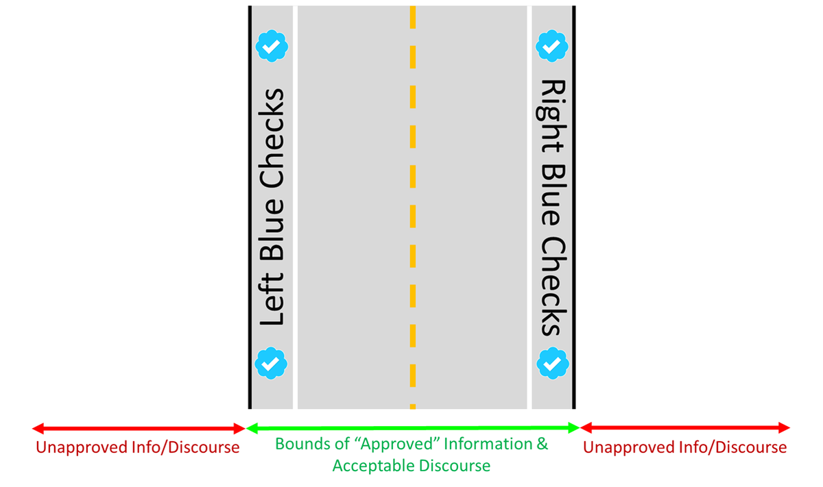 How Twitter works: Blue Checks are the influencers & set the boundaries & direction of acceptable discourse, w/Twitter's blessing. Venturing too far afield can get you into trouble. This is how the Overton Window of Twitter is constructed--but always w/Twitter as final arbiter.