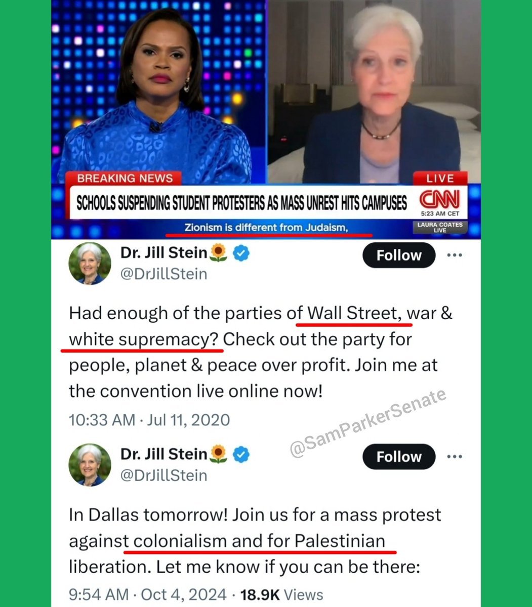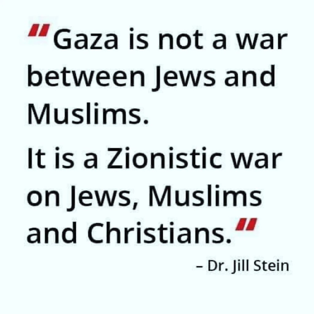 🚨🧵1/ JEWISH JILL STEIN: ZIONIST PLANT EXPOSED 📺 "I have many ties to israel. I have strong family ties to israel. My grandfather's name is 'Israel.' I don't want to see israel go up in flames ANY MORE THAN ANYONE ELSE." Jill Stein is running to protect israel. As we see with many jews who object to what israel is doing in Gaza, their primary concern is how it affects jews & israel--Palestinian needs are secondary. They're not nothing, but they are subordinate to the dangers presented to jews & israel. What's actually right & wrong for Gaza is secondary to her. That's why she says in the tweet below, rather disingenuously, that 'zionists are waging war on jews.' Always the victims. Incredible chutzpah. Jews are waging war on Palestine and some jews like Stein are worried about the blowback onto jews! But, there's more. (cont.)