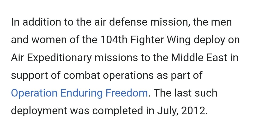 🧵3/ The last time the 104th Fighter Wing deployed was in 2012 to support *combat operations* in the Middle East as part of Operation Enduring Freedom. https://t.co/lkmJBZ3hQv