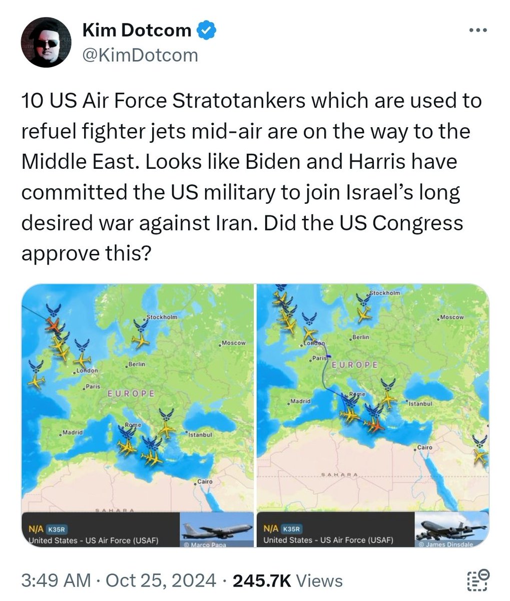 🧵4/ As reported by @KimDotcom this morning, over 20 KC-135 Stratotankers (jets used for aerial refueling) are en route to the Middle East from Europe (NATO locations). That is apparently enough to refuel 300 fighter jets in a single operation, which matches nicely the 272 operational israeli fighters.