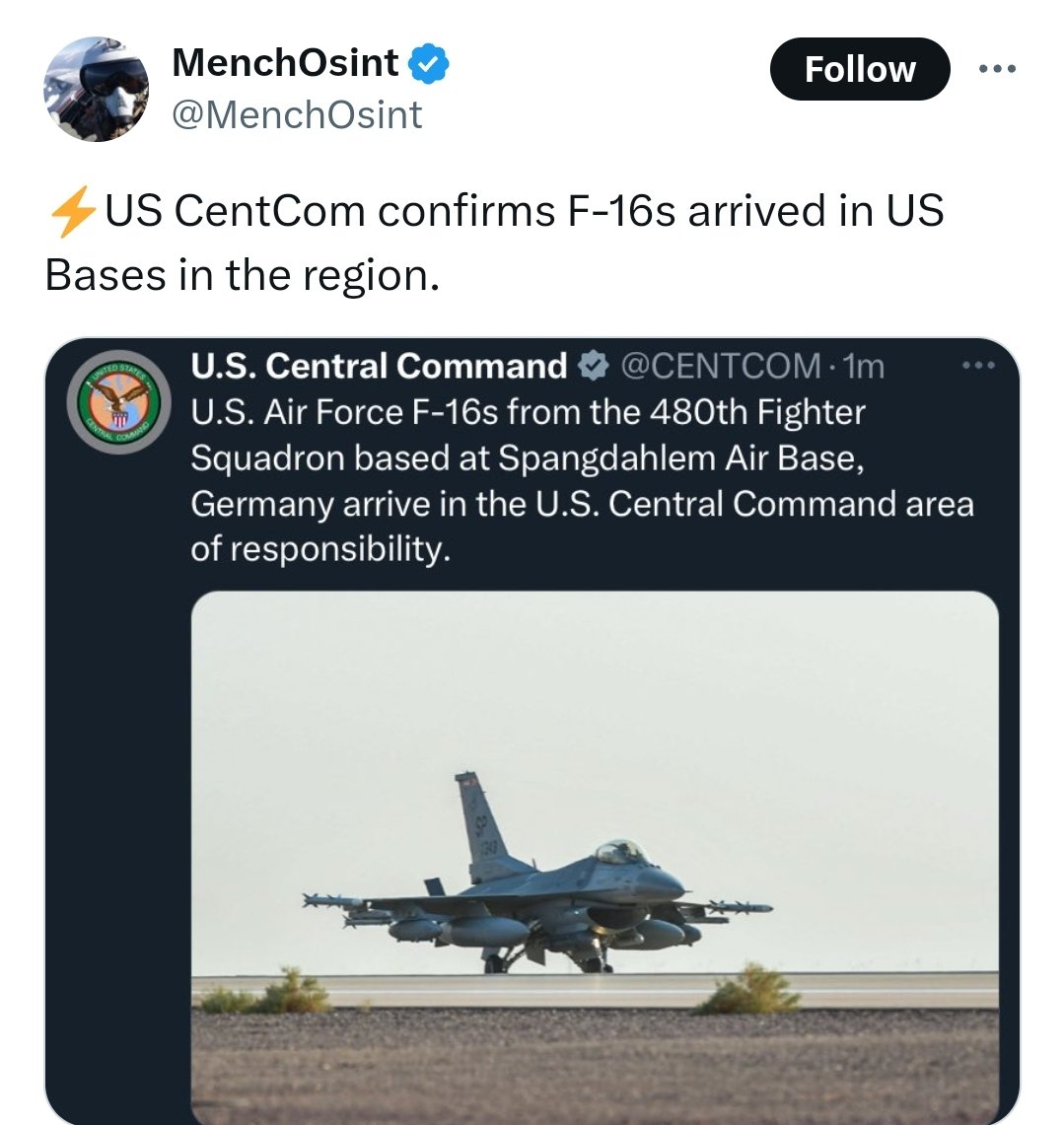 🧵7/ 🚨 Moments Ago: US CentCom confirmed arrival of F-16s from the 480th Fighter Squadron, who's specialty is "enemy air defense suppression." Major strike on Iran looming? Follow @MenchOsint https://t.co/pwK0At6S1T