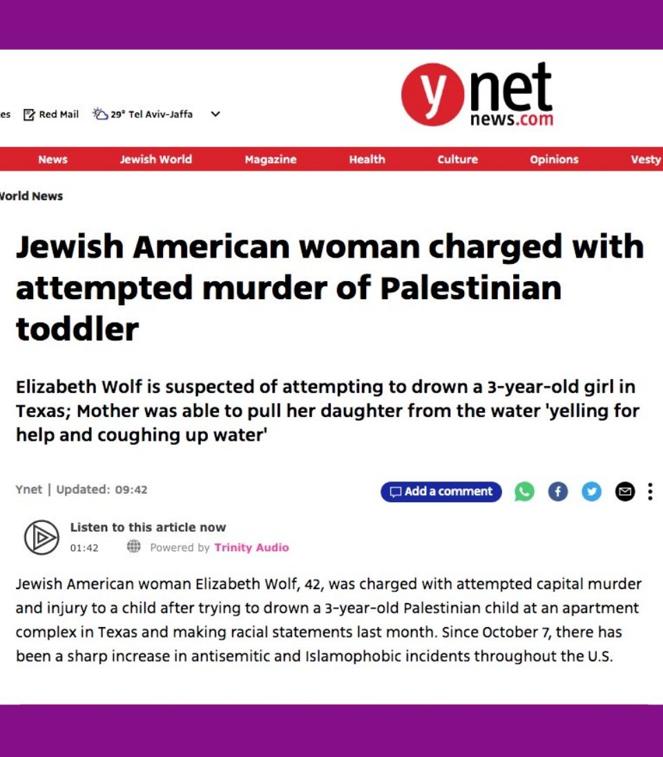 🚨🇵🇸🇮🇱 A jewish woman in Texas tried to murder a 3-yr Palestinian child; the media buried the story & the suspect's jewish background. "One report even said she was Muslim." Do you remember hearing about this story? Me neither. Via: @americafirstzoe, below. https://t.co/pW5XCv1AMV