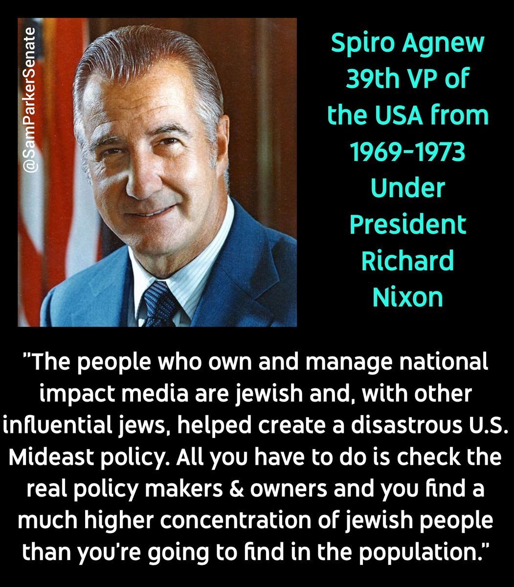 🇺🇸🇮🇱 Spiro Agnew was the Vice President under Richard Nixon. Like Nixon, Agnew was forced to resign from office, but for issues unrelated to Watergate. However, unlike Nixon, you don't hear much about him. That might be because he was essentially canceled. After he left office, he published a "fictional" novel in which the Vice President character in the book refers to "jewish cabals & zionist lobbies" and their hold over the American media. On the book tour, he asserted that this was also true in real life--a claim for which the ADL attacked him. He defended himself, saying "My contention is that routinely the American news media...favors the israeli position & does not in a balanced way present the other equities." Years later, in a letter to Fahd bin Abdulaziz--the Crown Prince of Saudi Arabia--he recounted how he'd been "bled dry" by zionist attacks on him, and blamed them for forcing him out of office. At the time, his charges were easily dismissed & his reputation smeared through that era's version of lawfare, but in hindsight I think it's safe to say he's been vindicated on the jewish/zionist points. Check out this beauty of a quote below about the American media & US Middle East policy, and tell me--where's the lie?