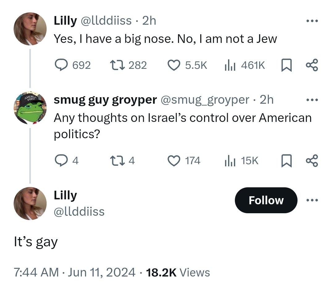 🇮🇱 This "based" chick who just exploded on my timeline yesterday blaming the problems of the world on "theater nerds" who "didn't get laid in high school," (soft-pushing degeneracy) denied being jewish. She might not be, but she's got some explaining to do. Looks like another gay jew-op. H/t: @Christ_gnosis
