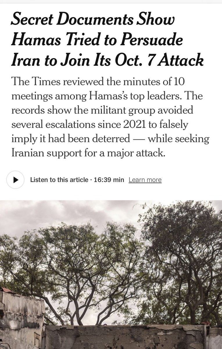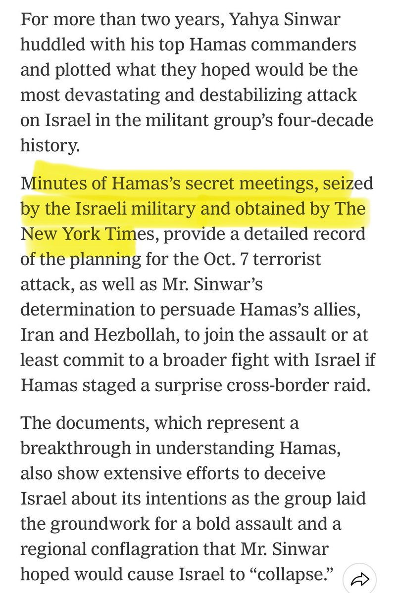 We’re supposed to believe that Hamas kept minutes of its meetings and the Israelis - who have lied & fabricated everything - happened to seize those minutes and gave them to the NYT. Two of the reporters on this story are Israeli: Bergman & Rasgon. Bergman is former IDF and Rasgon helped write one of the worst pieces early in this genocide, that justified the targeting & killing of Palestinian journalists.
