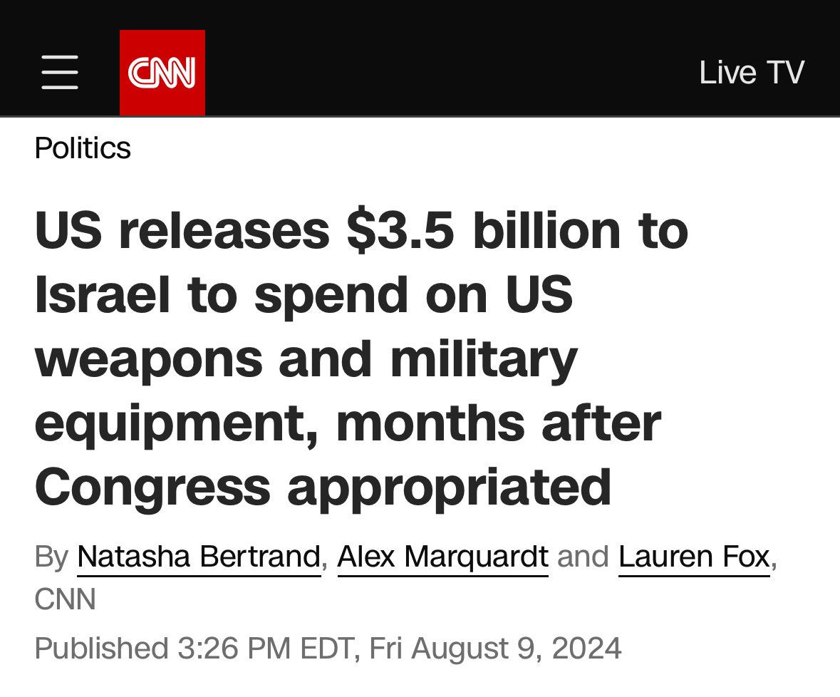 To recap today, the Biden-Harris administration: - released $3.5Bn in military funding to Israel - lifted a ban on offensive weapons sales to KSA - ended an investigation into an IDF unit accused of human rights violations (including the killing of an 80 year old Palestinian-American) & decided not to impose any sanctions on the unit All of these actions are (transparently) linked to supporting a belligerent Israel & other client states in what is a pending regional war.