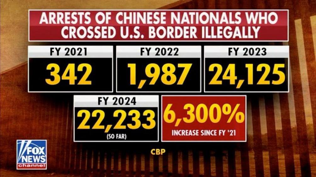 🚨ALERT Arrests of Chinese nationals who crossed US Border illegally up 6300% since 2021. In FY 2023 24,125 crossed illegally(not including get aways). Mostly young males. Arrested sounds like they are incarcerated and will be returned to China. NOPE. They are told to report to US authorities within 4 to 10 YEARS. Meanwhile they roam the nation. 24000 is a military division.