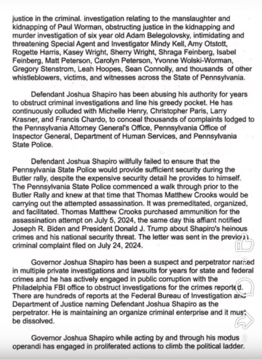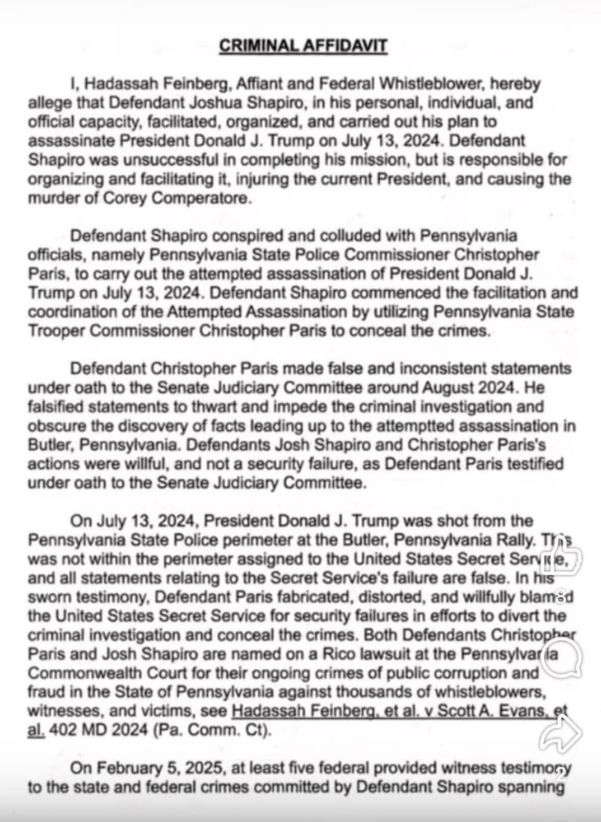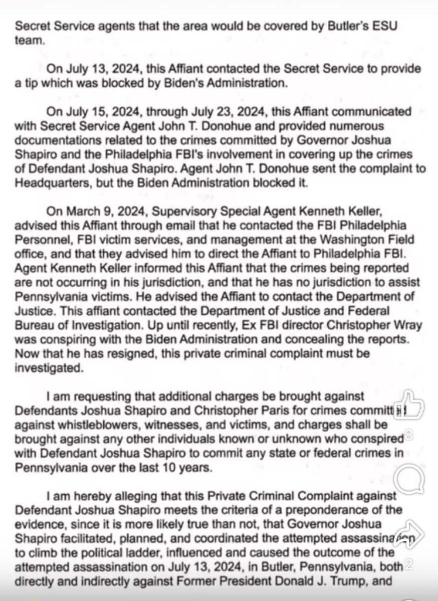 🚨The documents are authentic. 🚨 A former Pennsylvania State Police Employer has submitted an official criminal complaint alleging that Governor Josh Shapiro was involved in the attempted assassination of Donald J Trump. The complaint was submitted on February 7, 2025. She claims to have submitted a tip about this in July 2024, but said that it was blocked by the Biden administration. If true, this will be one for the history books.