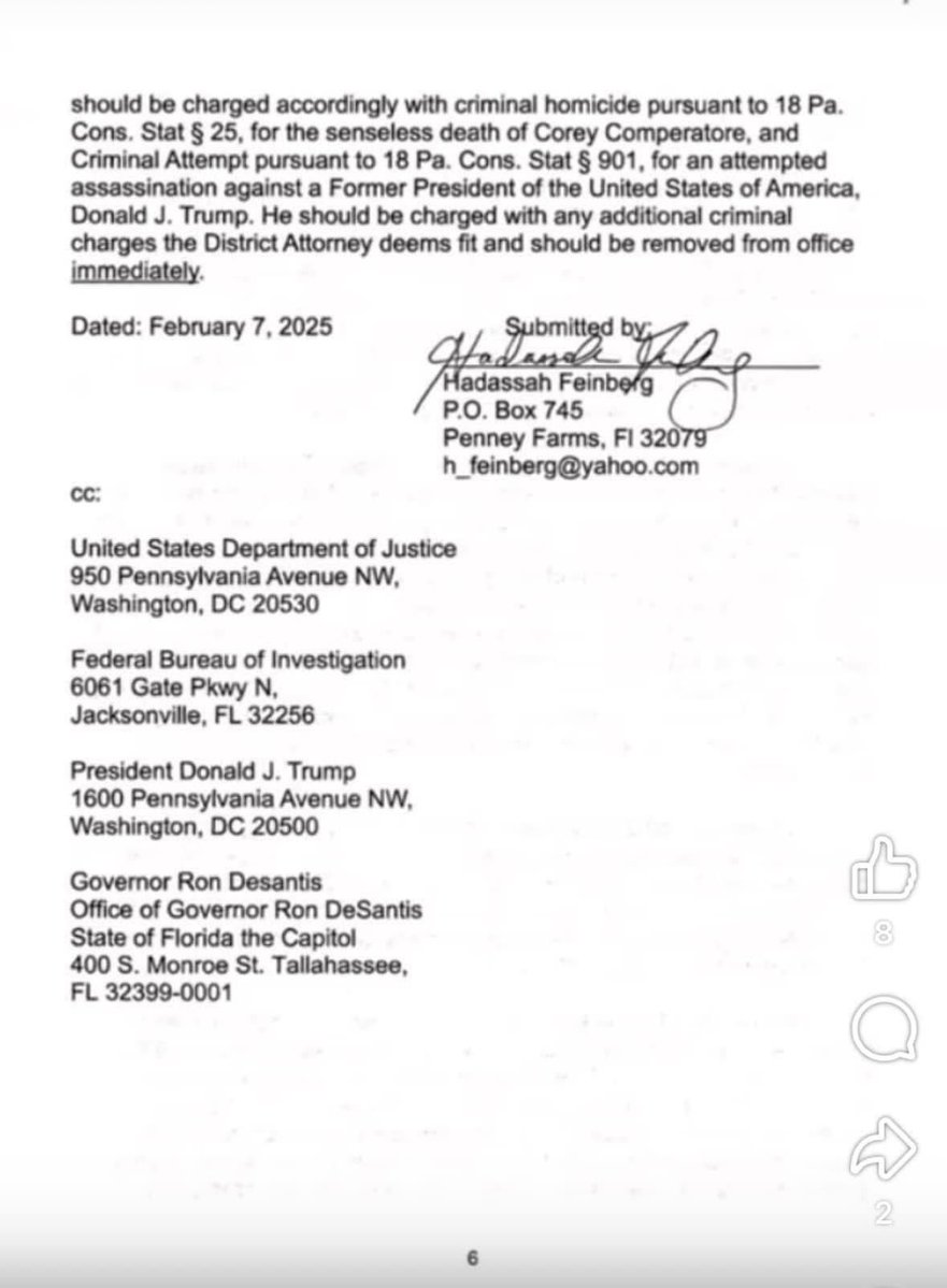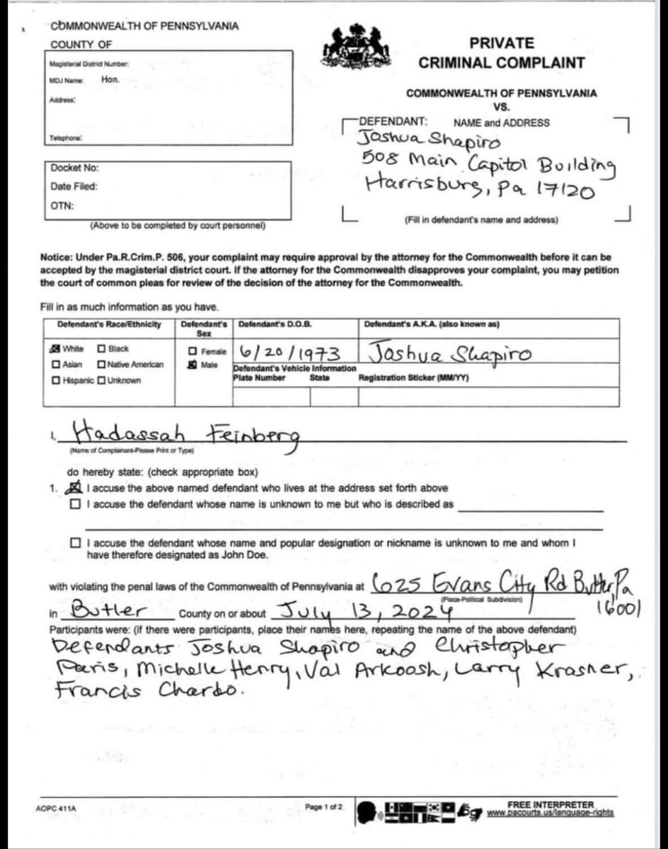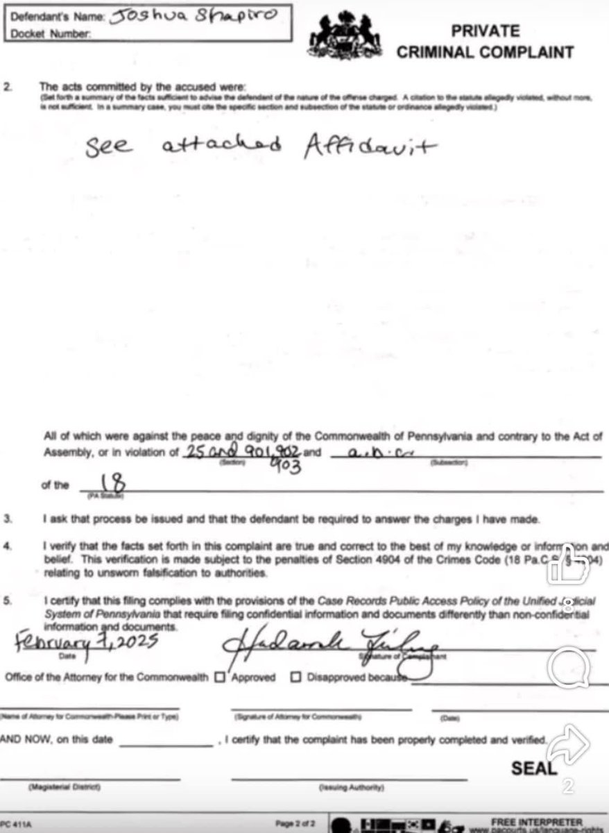 🚨The documents are authentic. 🚨 A former Pennsylvania State Police Employer has submitted an official criminal complaint alleging that Governor Josh Shapiro was involved in the attempted assassination of Donald J Trump. The complaint was submitted on February 7, 2025. She claims to have submitted a tip about this in July 2024, but said that it was blocked by the Biden administration. If true, this will be one for the history books.