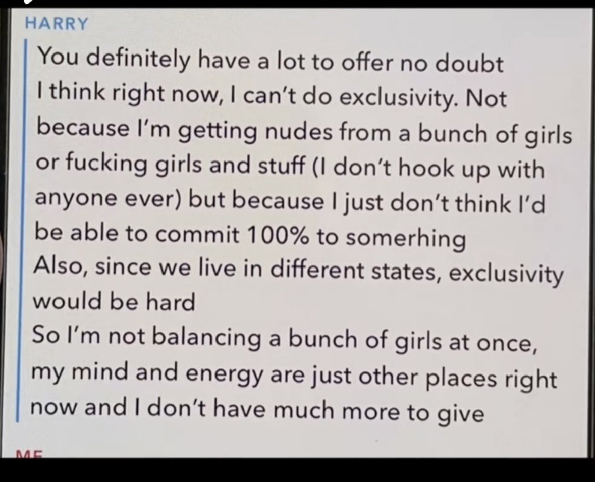 Carlee, one of Harry’s victims, has described the situation in the most detail. Summary of her videos - According to Carlee, Harry “wooed” her from the very beginning. And convinced her that he respected her for more than physical appearance. She said even though she’s embarrassed to admit it, she created a private chat to chat with Harry that was meant for his eyes only, where she shared explicit photos of herself with him. “He loved it. He loved that I was not entertaining anyone else the way I was entertaining him”. Harry told her that she was “wifey material” and was “sold” on her wife applications. After six months of this behavior, he told her he didn’t want a commitment. She accused him of leading her own. To which he admitted to doing. But also said “he should have made his intentions clear”. 😑 Directly after this, Harry posted a photo of a “thirst trap” of him and his new girlfriend on TikTok. The video shows him lying in bed with a girl while she provocatively swipes her hand across his face. Prior to the thirst trap, Carlee watched Harry go live and observed hickeys on his neck from a DIFFERENT girl. She confronted Harry, and he told her she was “overreacting”. Carlee had recently been through a traumatic car accident and was dealing with depression at the time. Carlee stated that Harry pounced and took advantage of her sadness. Carlee decided to go live on TikTok to share her story, and this when she discovered that during the nine months that she was talking to Harry, Harry was leading multiple other women on at the exact same time. He had told them the exact same things and had convinced them to send him explicit messages through the Snapchat platform. Harry had told the other woman that he “had no roster”.