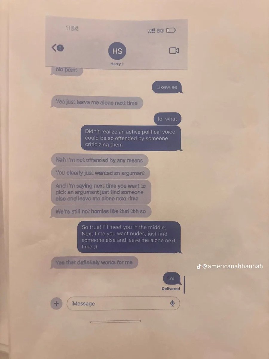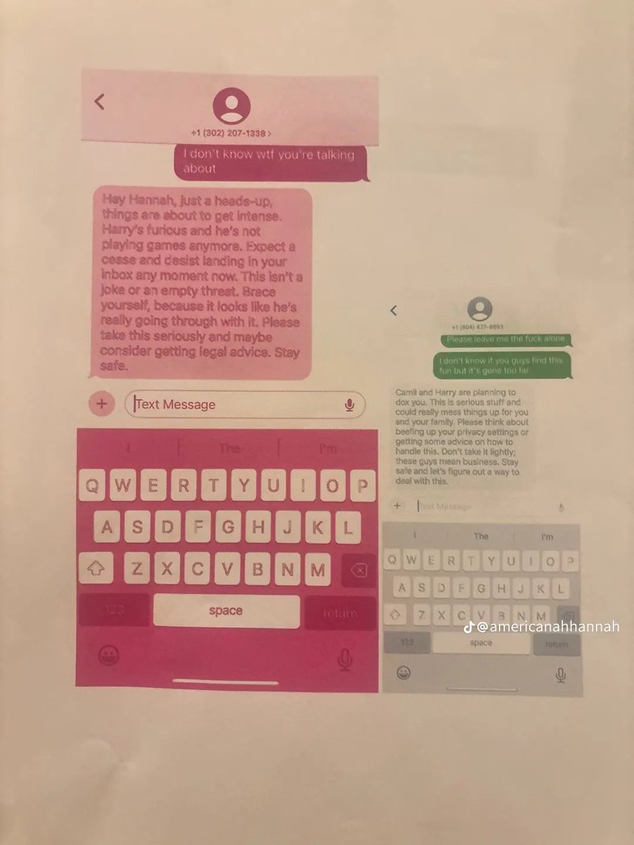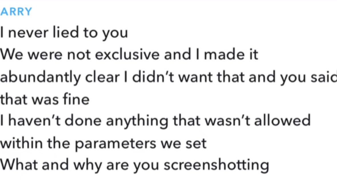 One of the women, who is terrified of Harry’s retaliation, has stated that Harry assured her the screenshots were all fake. But also told her that “he doesn’t feel bad about lying about personal things”. He told her he “didn’t lie to her, though”. He then asked her if she wouldn’t mind telling people that she had seen screenshots from him “proving they were fake”, even though she had not. I have been provided the evidence for this. However, she does not want to have the screenshots provided publicly. If the status of this changes, I will provide receipts.