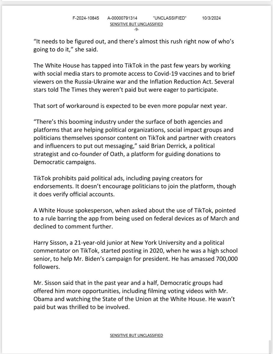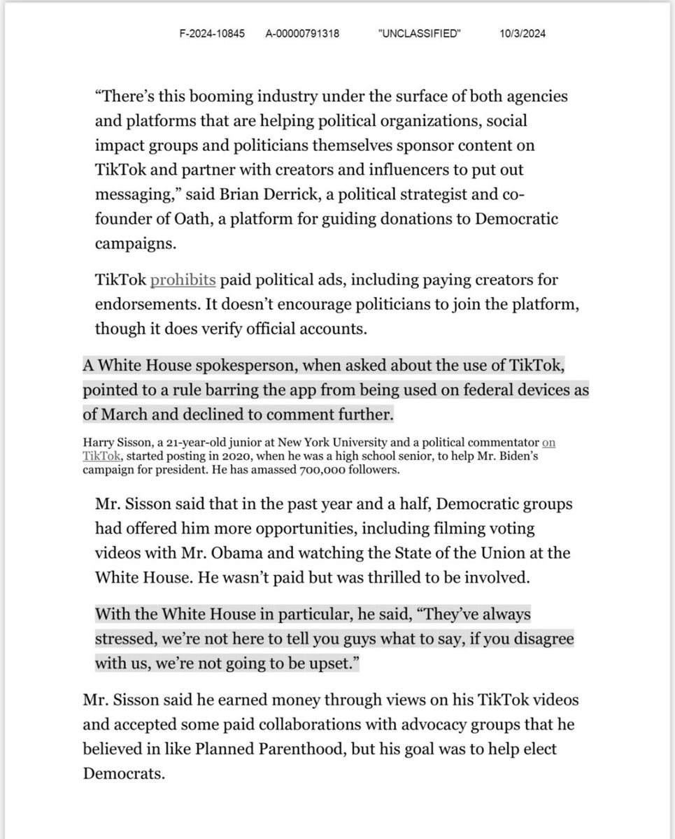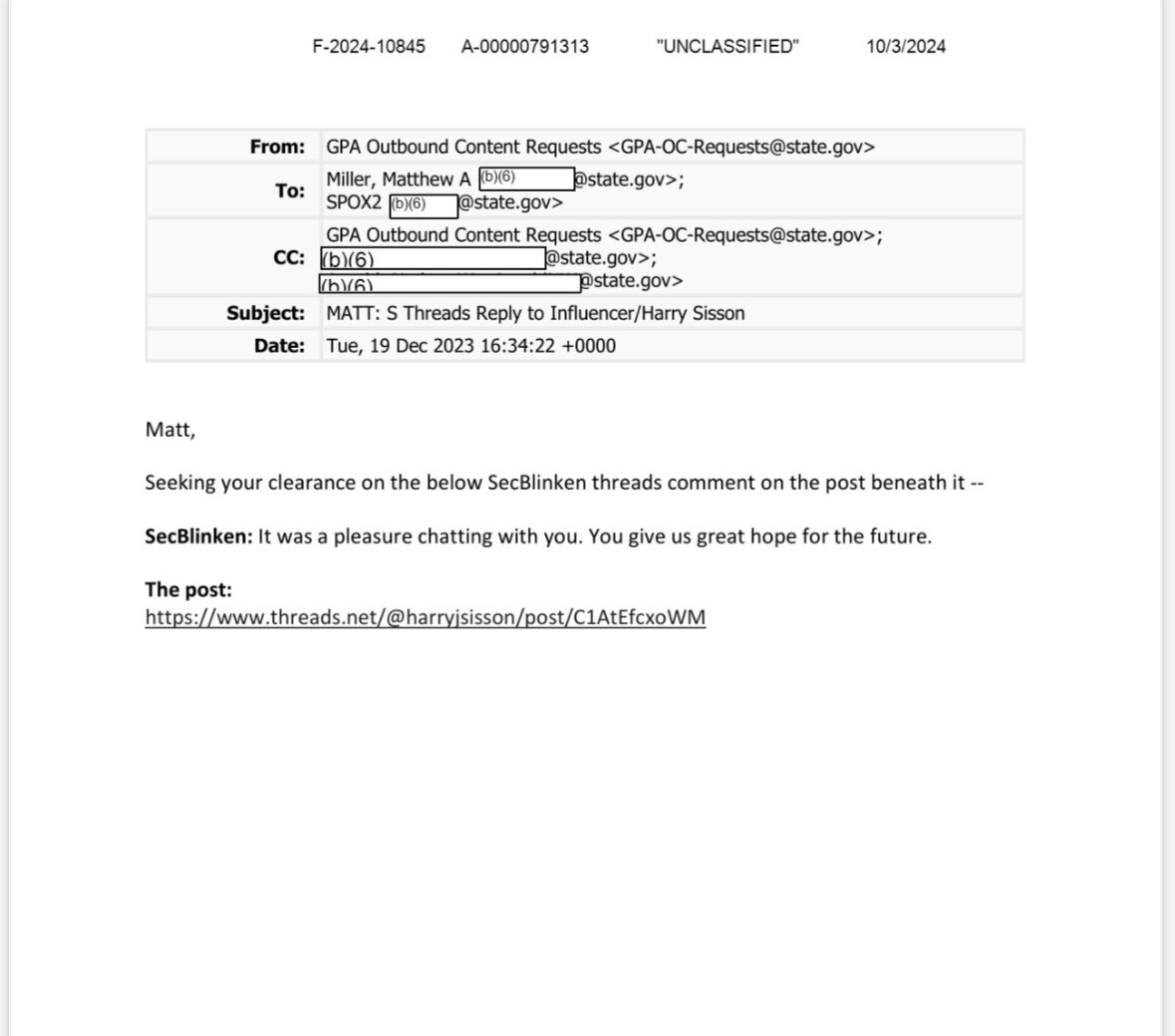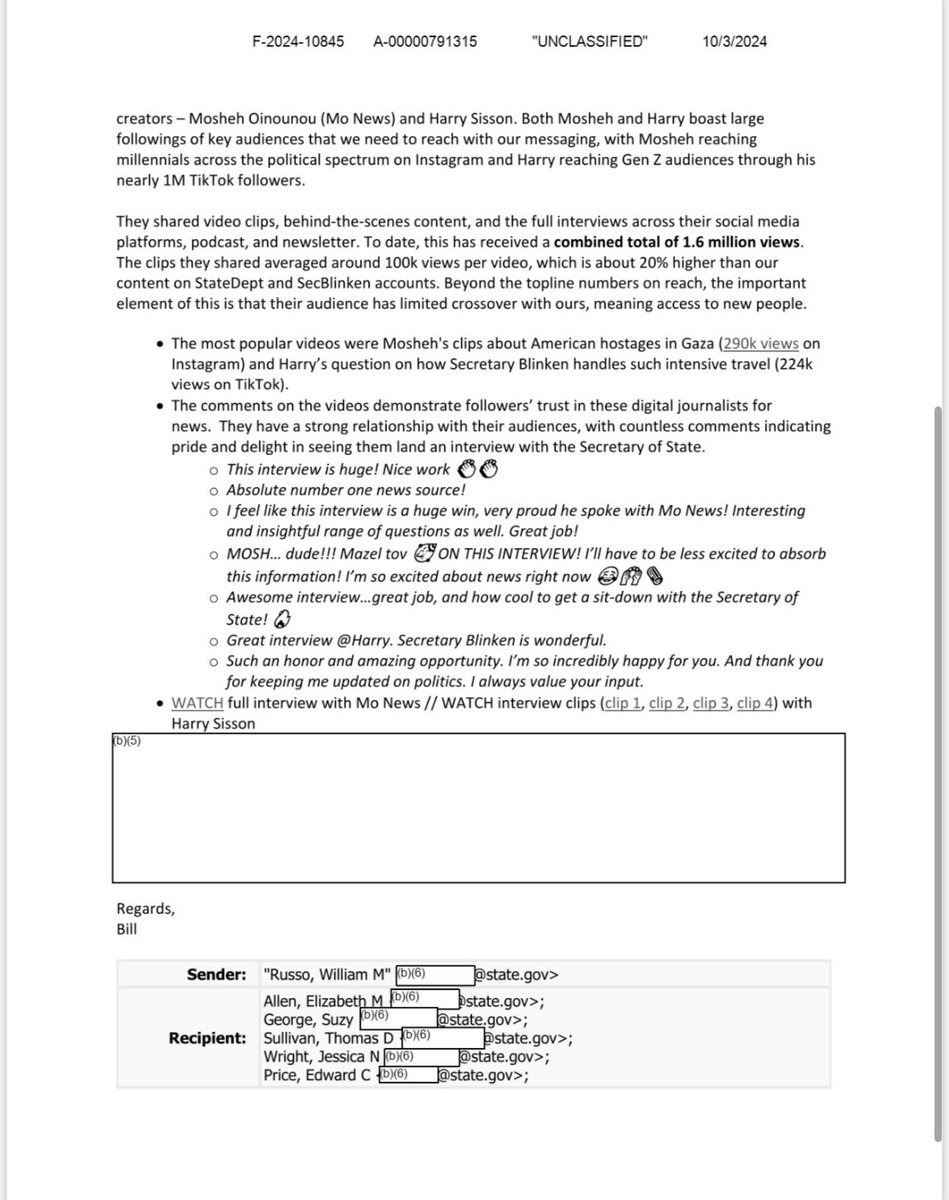 🚨Open Records Reveal: Harry Sisson Not Only Received Coaching and Scripts for His Interview with Secretary of State Blinken, But Has CONTINUED to Receive Scripts for TikTok from the Secretary of State as Recently as October 2024 🚨 In April 2024, I released requested records from the Office of Governor Josh Shapiro. The records reveal texts, emails and correspondence between the Governor’s office, Harry Sisson and Palette Media. We already know Harry is being paid. This was proven repeatedly by myself and MULTIPLE others, I didn't aim to keep rehashing the worn-out issue of Harry's compensation. The records I obtained don’t just prove he was paid, but that his “interviews” are not organic. He is a used, coached puppet by the left with little to zero original thought. Every question is scripted, coached and timed. And when Sisson wanted to ask his own questions, he had to receive approval from Shapiro’s staff. This reveal was received with outrage from the left and right alike. As you can see in a video screen of Harry’s live, he desperately attempted to discredit my report. He stated that he was never coached and that it was all a conspiracy theory. Even though my records came straight from the office of Shapiro. My records also revealed that there are serious legal implications to how Sisson and many other influencers are operating. The courts have upheld disclosure laws over and over again. With the general consensus being that “disclaimers provide critical information about advertising sources so that the electorate can more effectively judge the arguments they hear” (FEC website). I will attach my prior post on Sisson and Shapiro in the thread. It is an important part of my release today. Why? Because NOW officials have started COVERING for Harry. The official letter sent to me, along with the Sisson file, made it clear that redactions would be made because of what the office of the Secretary of State called “foreseeable harm”. (What harm? EXPOSURE?) What was redacted? 👉👉Harry’s SCRIPTS were redacted. The following thread contains the full file I received. The records show that this goes much deeper than Harry Sisson. The file shows that TikTok creators are being used to influence the election, with zero disclosure. Certain narratives such as “h@m@s is being asked to ceasefire” and that the “Ukraine War is a LONG war”. Also an interesting side-note, William Russo, the Assistant Secretary Bureau of Global Public Affairs, went on sabbatical in April 2024, directly after these records were requested. (Continue in 🧵)