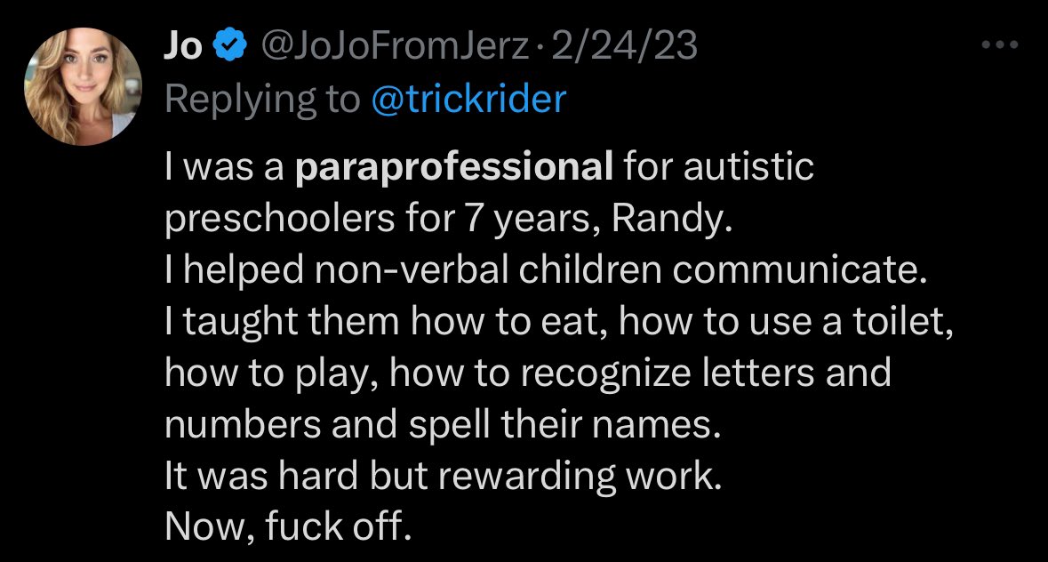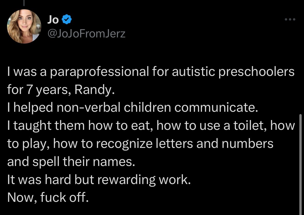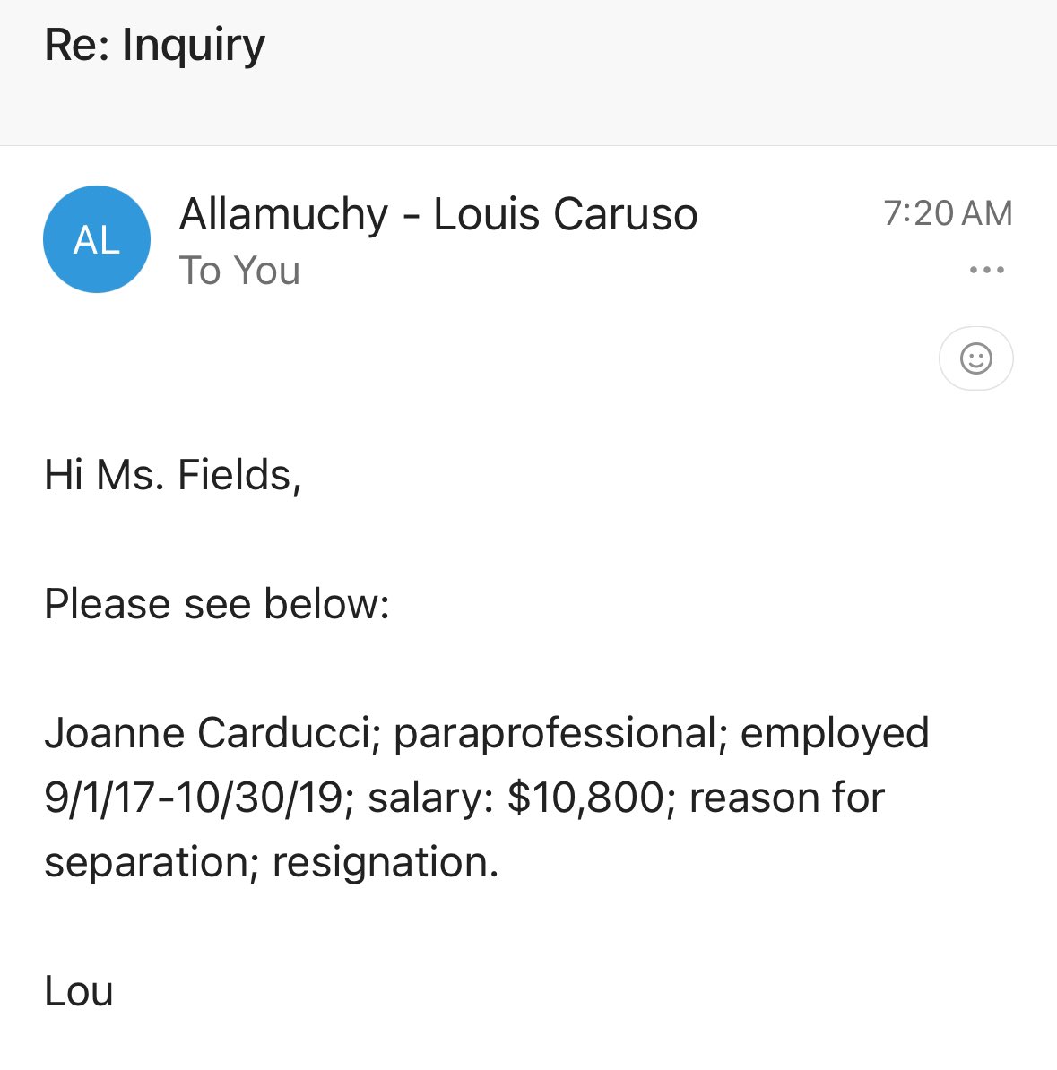 Records from Louis F. Caruso, the School Business Administrator and Board Secretary for Allamuchy Township School District in NJ, reveal that Joanne Carducci (Aka @JoJoFromJerz on X) was only employed as a paraprofessional for two years. She started 9/1/17 and resigned on 10/30/19. Prior to 2017, she worked as a Sizzler waitress. According to the records I have obtained so far, she did NOT work as a paraprofessional for 7 years, she did NOT work with “preschool age autistic children”, and she was not working as a paraprofessional in 2020, 2021 or 2022. (As she claims in her tweets). Please see thread for multiple screenshots of the lies she has told as well as a record of the email from NJ. More to come.