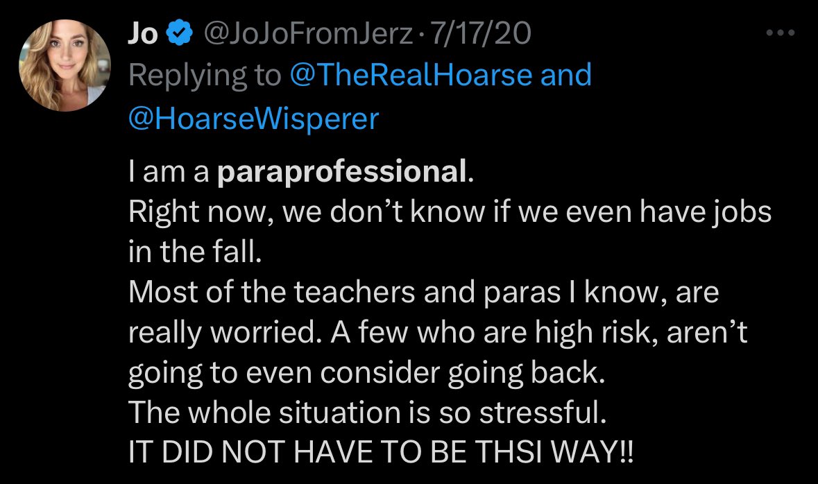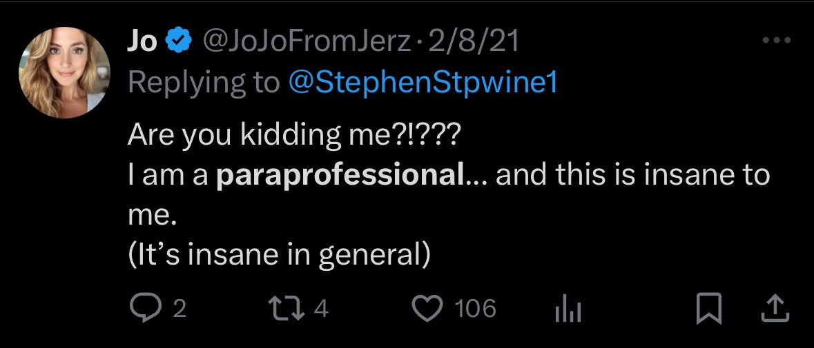 If you want to see more of her falsehoods, go to her profile and type in ‘paraprofessional’ to see her past posts about this issue.