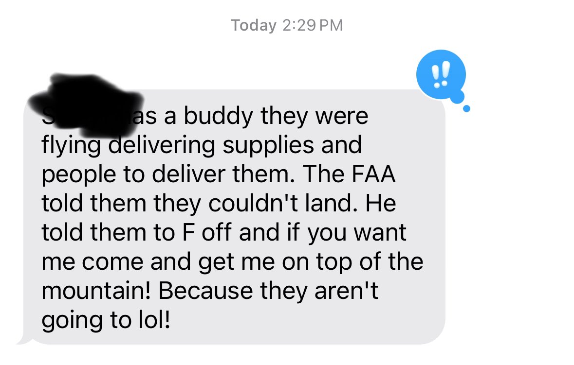 A good friend in North Carolina just told me that her husband has a military buddy who was flying, delivering supplies and personnel. The FAA instructed them that they couldn't land. He told them to "F off" and said, "If you want me, come and get me on top of the mountain!" We need more of THIS. 💪