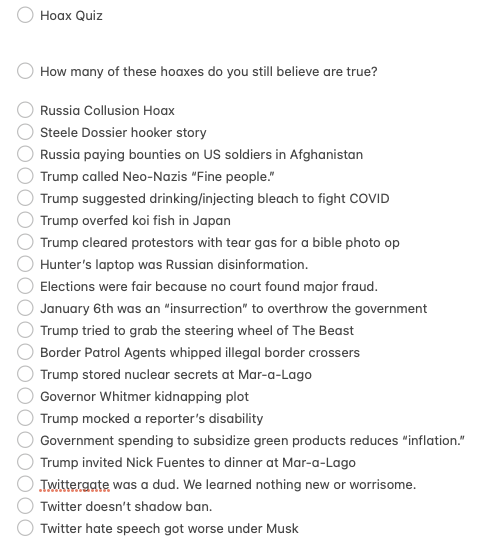I updated the Hoax Quiz. Hoax Quiz How many of these hoaxes do you still believe are true? Russia Collusion Hoax Steele Dossier hooker story Russia paying bounties on US soldiers in Afghanistan Trump called Neo-Nazis “Fine people.” Trump suggested drinking/injecting bleach to fight COVID Trump overfed koi fish in Japan Trump cleared protestors with tear gas for a bible photo op Hunter’s laptop was Russian disinformation. Elections were fair because no court found major fraud. January 6th was an “insurrection” to overthrow the government Trump tried to grab the steering wheel of The Beast Border Patrol Agents whipped illegal border crossers Trump stored nuclear secrets at Mar-a-Lago Governor Whitmer kidnapping plot Trump mocked a reporter’s disability Government spending to subsidize green products reduces “inflation.” Trump invited Nick Fuentes to dinner at Mar-a-Lago Twittergate was a dud. We learned nothing new or worrisome. Twitter doesn’t shadow ban. Twitter hate speech got worse under Musk Derek Chauvin killed George Floyd NATO Funding Hoax Trump vowed there would be a “bloodbath” if he’s not re-elected. Russia Hoaxes broken out 1. Russia collusion hoax (the original) 2. Russian bounties on American soldiers hoax 3. Hunter laptop was Russian disinfo hoax 4. Trump responsible for Navalny's death hoax 5. Trump invited Russia to attack a NATO country that doesn't pay its bills hoax 6. FBI informant for the Biden bribes is a Russian spy (probable hoax) 7. Putin blew up his own pipeline hoax. 8. NEW: Trump is romantically attracted to Putin. 9. Russia is behind the anti-vax movement (Peter Hotez) 10. Alfa Bank hoax 11. Hamilton 68 Hoax 12. Embassy sonic weapon hoax 13. Navalny died of a blood clot 14. Russia is losing in Ukraine