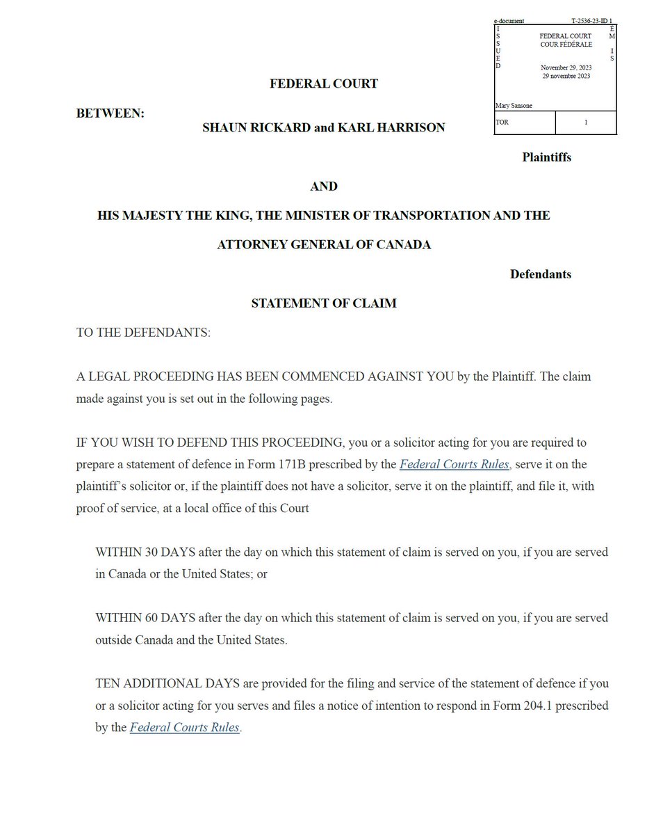 WE JUST FILED A SECOND LAWSUIT AGAINST THE GOVERNMENT - Vaccine Travel Mandates In our new lawsuit, which we filed with the Federal Court today, we are now suing the Government for damages - Link to our Statement of Claim below. We have taken this unexpected path as it appears to be the only option we have left to potentially ensure that the extensive evidentiary record that we compiled from our original Vaccine Travel Mandates lawsuit will be heard in Federal Court, in a public hearing. This option was actually presented to us at our Mootness hearings, by both Justice Gagne (Federal Court) and Justice Locke (Federal Court of Appeal). Both Judges also went on to clearly state that the evidence from our original case could be submitted in any future damages claims or lawsuits. To be clear, right from the get go it was never our intention to seek financial compensation, we didn't want to appear to be looking to make any monetary gains from our lawsuit. It was always solely about ensuring that the Canadian government could never implement or invoke such tyrannical and unconstitutional mandates on Canadian citizens ever again. However, our seemingly compromised judiciary and so called legal system have essentially left us with no choice, not if we are to have any hope whatsoever of having our case heard at a public hearing anyway. I will shoot a video in the coming days when we all have more time to provide you all with a more detailed explanation and breakdown as to what our strategy is, and the rationale behind why we chose this new direction in our search for justice. You can review a copy of our Statement of Claim here: https://statementofclaimfiledtofederalcourt.tiiny.site/